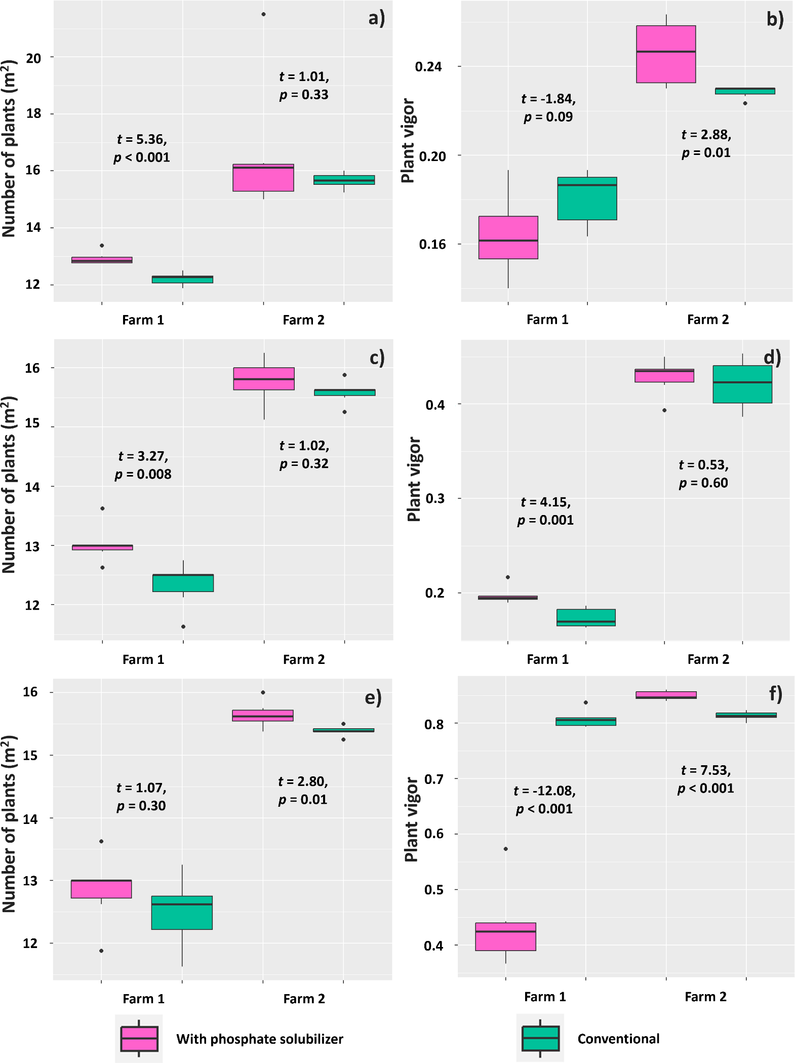 Mean number of plants per m2 and plant vigor assessed at 14 (A, B), 21 (C, D), and 35 (E, F) days after emergence of Glycine max plants subjected or not (conventional treatment) to inoculation with a biofertilizer based on phosphate-solubilizing rhizobacteria (Bacillus velezensis and Lysinibacillus fusiformis). Data acquired in experiments conducted in 2 farms. Horizontal bars within boxplots represent the median of six replications per treatment. Points outside the boxes are outliers. Values above the boxes were obtained using the Student’s t-test (p< 0.05).