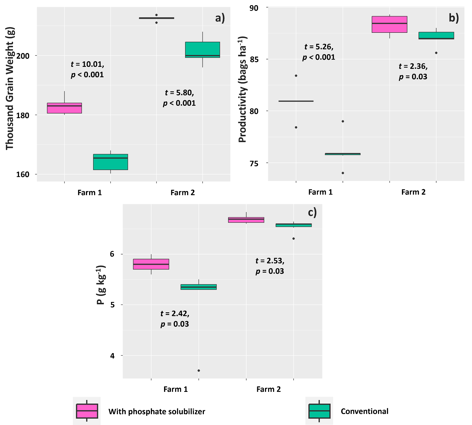 The treatments affected 1000-grain weight, grain yield, and P content in grains of soybean plants evaluated on both farms. The means found for these variables were higher for plants treated with the PSR-based biofertilizer on both farms. The mean 1,000-grain weights were 183 and 164.41 g (Farm 1) and 212.46 and 201.50 g (Farm 2) for plants subjected to the biofertilizer and conventional treatments, respectively (Figure 11A).