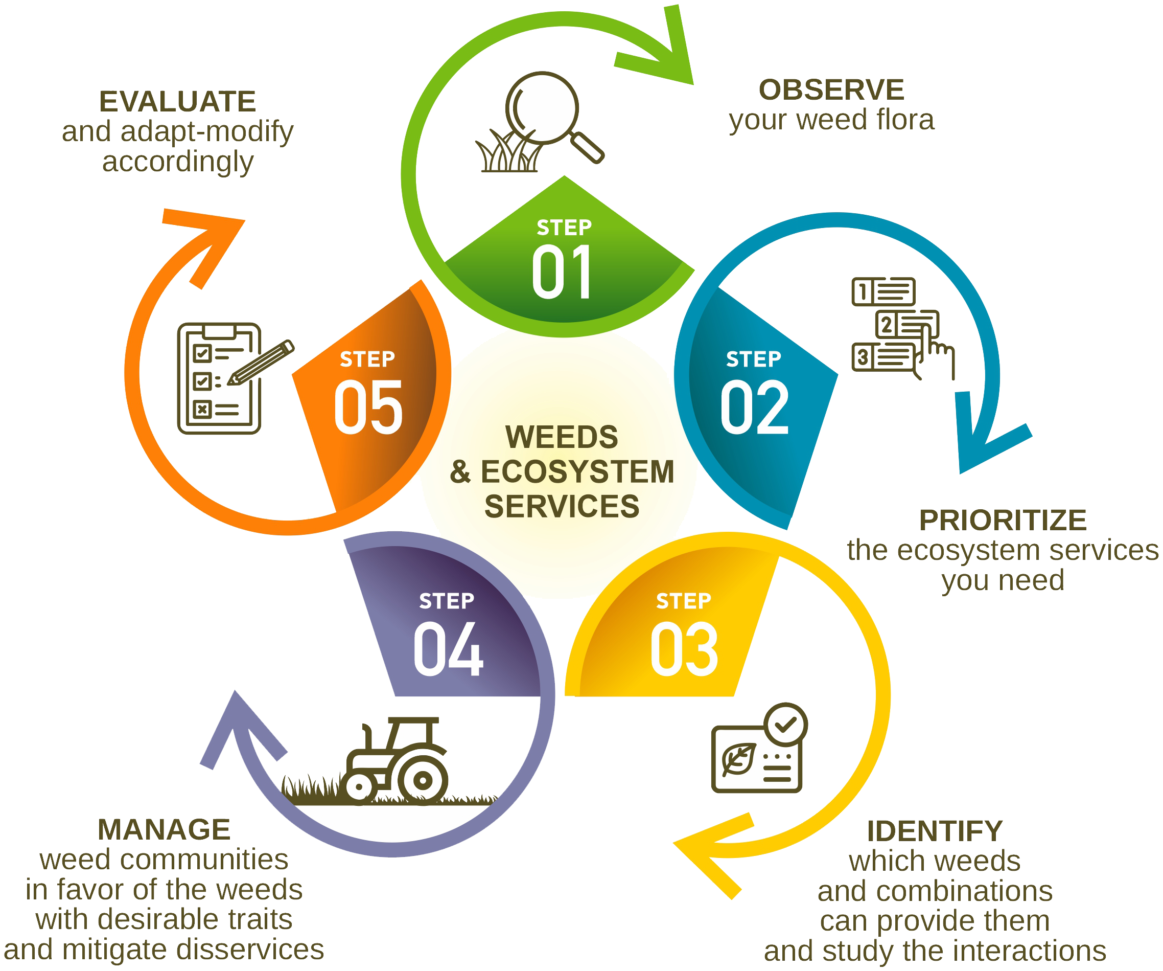 We hereby propose a specific sequence of steps to be taken in the identification, assessment, and promotion of service weeds and natural vegetation in agroecosystems that can provide ecosystem services (Figure 1).