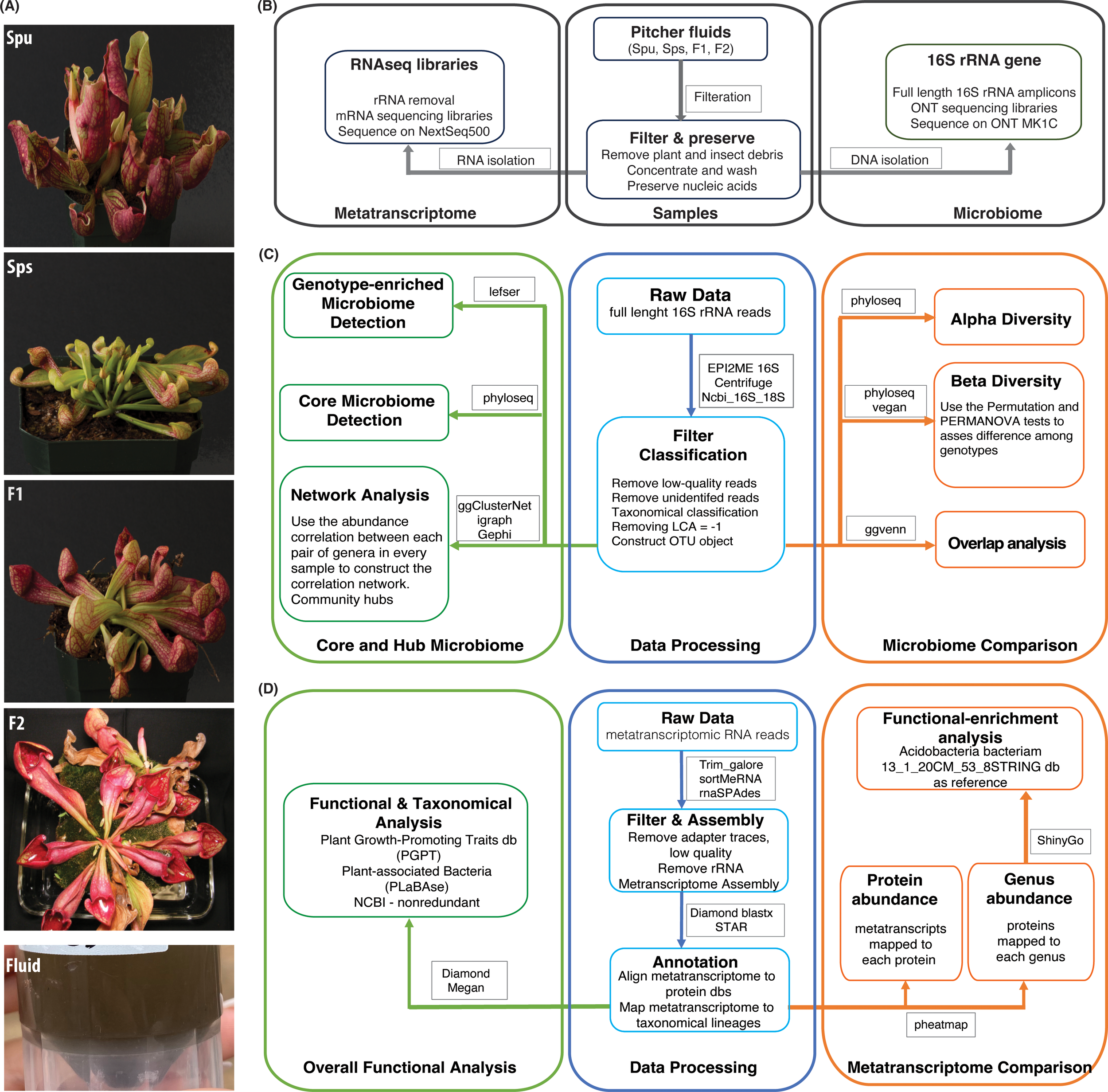 Summary of the experiment and analysis pipelines. (A) Photos of the parents (Spu and Sps) and selected F1 and F2 individuals of the Spu X Sps mapping population, and a sample of the collected pitcher fluid. (B) The experimental process of preparing the pitcher fluid samples and sequencing. (C) Modules of the 16S rRNA microbiome analysis pipeline. (D) Modules of the metatranscriptome RNA analysis pipeline.