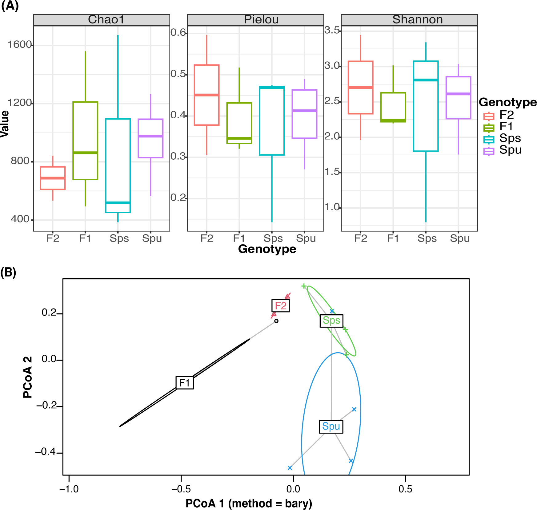 We utilized the Alpha diversity test to evaluate microbial diversity within each group, that is, among replicates of the same genotype (4 Spu, 3 Sps, 3 F1, and 2 F2). The alpha diversity was assessed using three methods: Chao1 (Chao, 1984), Pielou’s Evenness (Volvenko, 2014), and Shannon (Shannon, 2001). The pairwise Wilcoxon test (Wilcoxon, 1992) was then used to test the significance of the variance of the alpha diversity among genotypes. The difference in the microbiome composition among genotypes was calculated using beta diversity analysis, followed by visualization using PCoA (Principal Coordinate Analysis) (Gower, 1966). The sample distances were calculated using Bray-Curtis distances (Bray and Curtis, 1957; Kers and Saccenti, 2022).