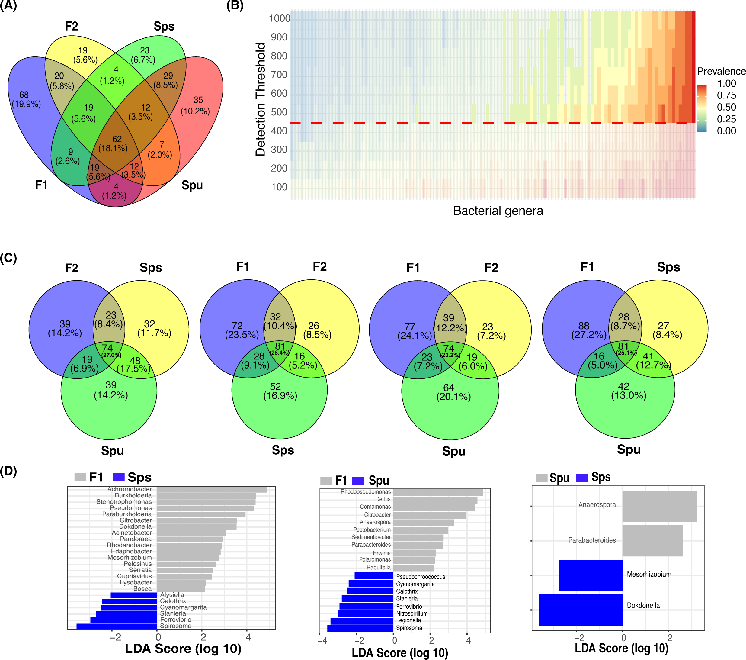 The core and genotype enriched microbiome analysis. (A) A Venn diagram showing the number of overlapped genera among Spu, Sps, F1, and F2. (B) Heatmap of the prevalence of different microbiomes under different detection thresholds. The detection value and prevalence cut-off limits are represented by the horizontal red line and transparent area, respectively. (C) Four Venn diagrams comparing the overlapping genera among every three genotypes to highlight the genotype specific numbers. (D) Genotype-enriched genes detected by Linear discriminant analysis Effect Size.
