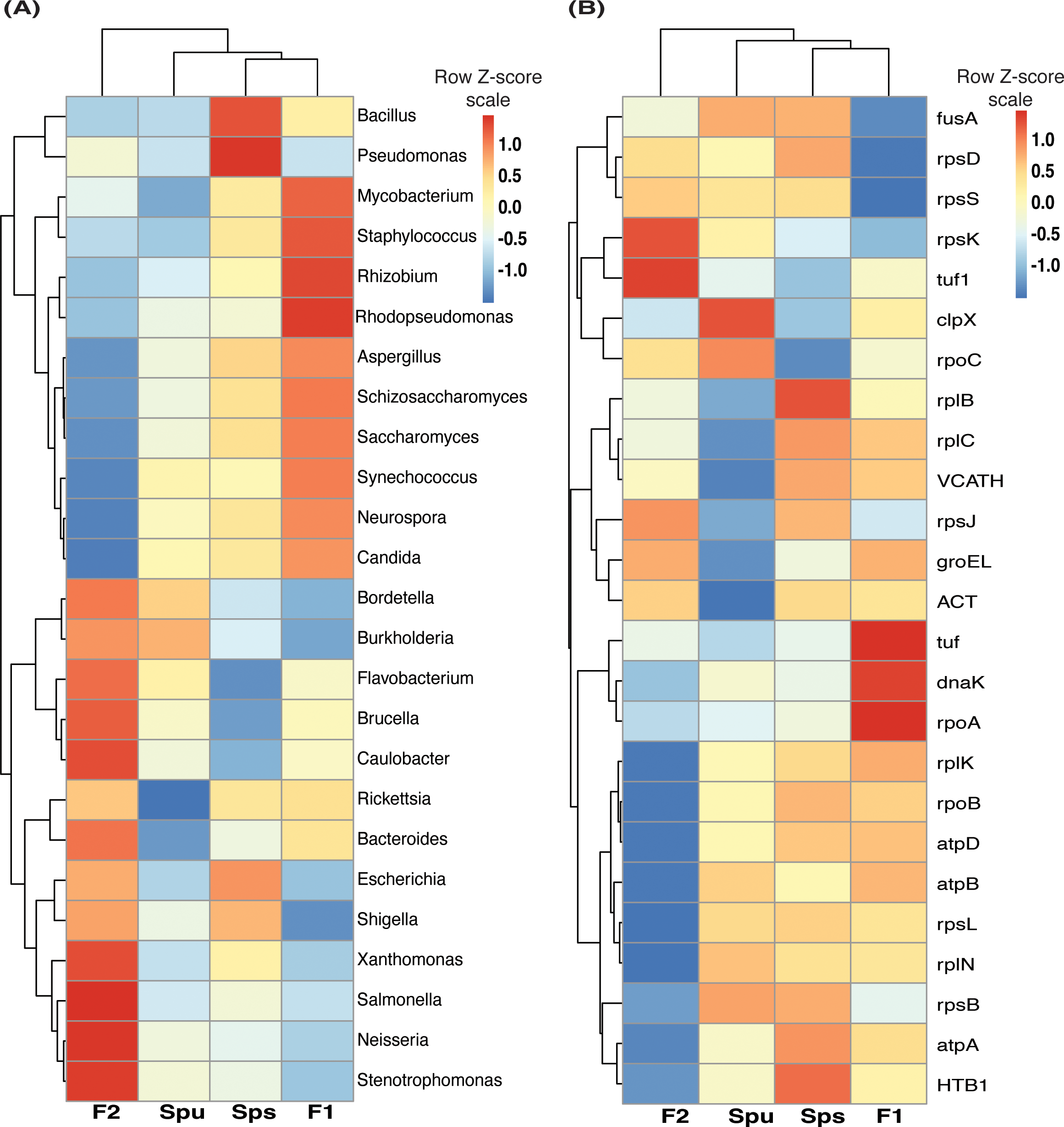 In order to determine the abundance of taxa, the count matrix was transformed from reads per protein to genus abundance. The genus abundance was determined by counting all metatranscripts mapped to proteins from the same genus (according to the uniprot_sprot annotation) for the Spu, Sps, F1, and F2 samples. Next, we calculated the z-core and p-value for each genus count in each sample and filtered out all genera with p-values > 0.05. The TMM method was used to normalize the abundances of the filtered genera. Similarly, in order to identify prevalent proteins, the metatranscripts count matrix was transformed into a metaprotein abundance matrix. The metaprotein abundance was determined by counting the metatranscripts mapped to the same protein, based on the uniprot_sprot annotation, from multiple genera. Next, we calculated the z-core and p-value for each metaprotein count in each sample and filtered out all metaproteins with p-values > 0.01, followed by a TMM normalization.