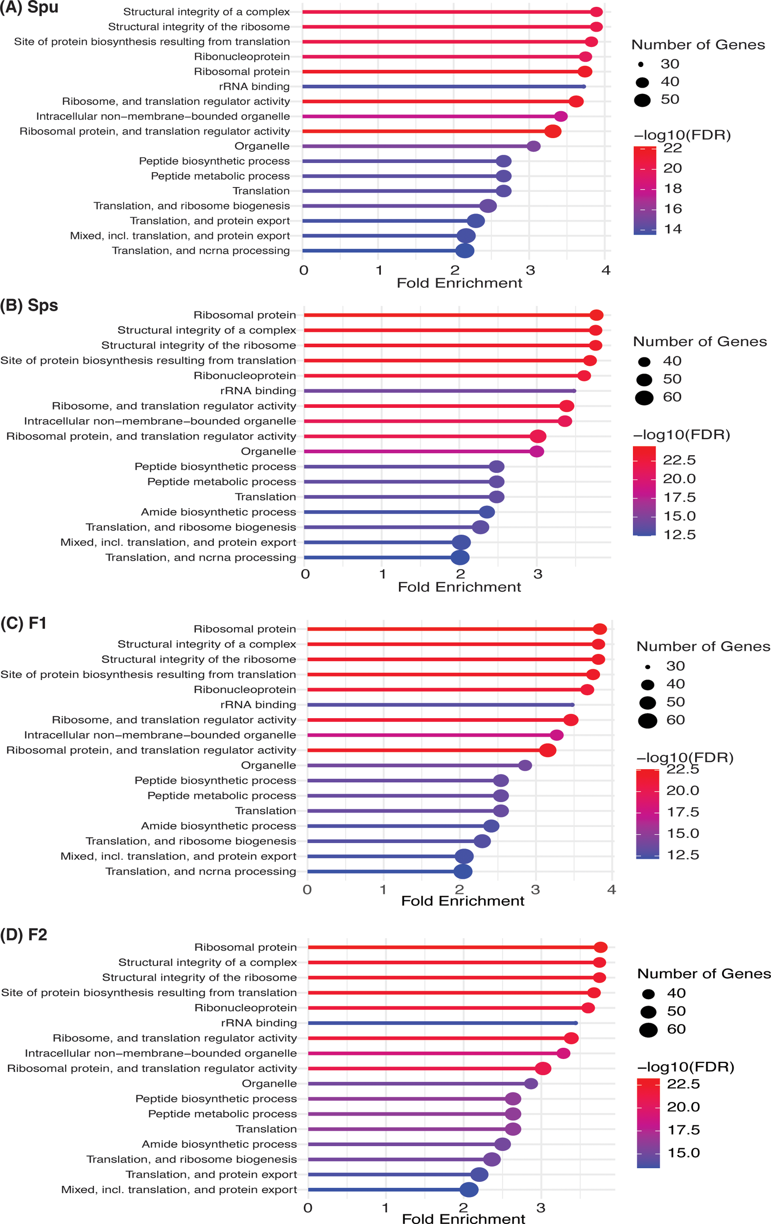 In the genotype-enriched microbiome, 35 genera (10.2%) are unique to the Spu genotype, 23 genera (6.7%) to the Sps genotype, 68 genera (19.9%) to the F1 genotype, and 19 genera (5.6%) to the F2 genotype (Figure 3A). The results show that the microbiome of the F1 genotype differs significantly from that of the other genotypes. A similar observation can be obtained from the comparisons presented in Figure 3C. The microbiomes of the two parents (Sps and Spu) exhibit a greater similarity to each other than to either the F1 or F2 microbiomes (Figure 3A). The proportion of shared genera between Sps and Spu microbiomes is 37.8% when compared to F1 and 44.5% when compared to F2 microbiomes, which is much higher than the overlap between F1 and F2 microbiomes (Figure 3C). The overlaps between F1 and F2 microbiomes are 35.4 relative to the Spu and 36.8 relative to the Sps microbiomes. The results confirm that the Sps microbiome is similar to that of Spu, while the F1 microbiome is more closely related to the F2 microbiome (Figure 2B).