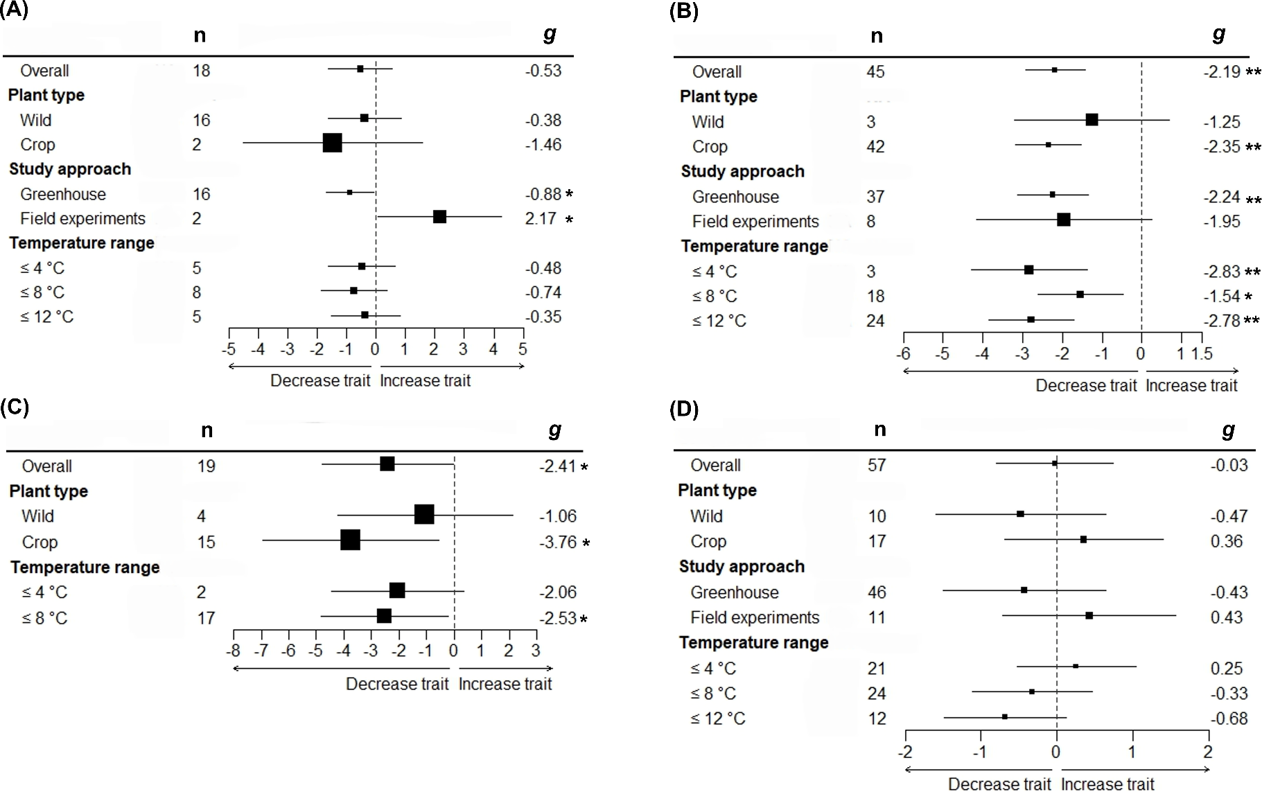 Group-specific mean effect sizes (Hedges’ g) for floral rewards traits in response to increasing air temperature. Nectar sugar concentration (A), Pollen germination (B), pollen viability (C) and pollinator visit (D) phylogenetically uninformed models. Effect size g have been grouped according to plant type, study approach and temperature range. Mean effect size, their 95% confidence interval (CI) and the number of effect sizes (n) for phylogenetically uninformed overall and with moderator models are shown. *P < 0.05; **P < 0.01.