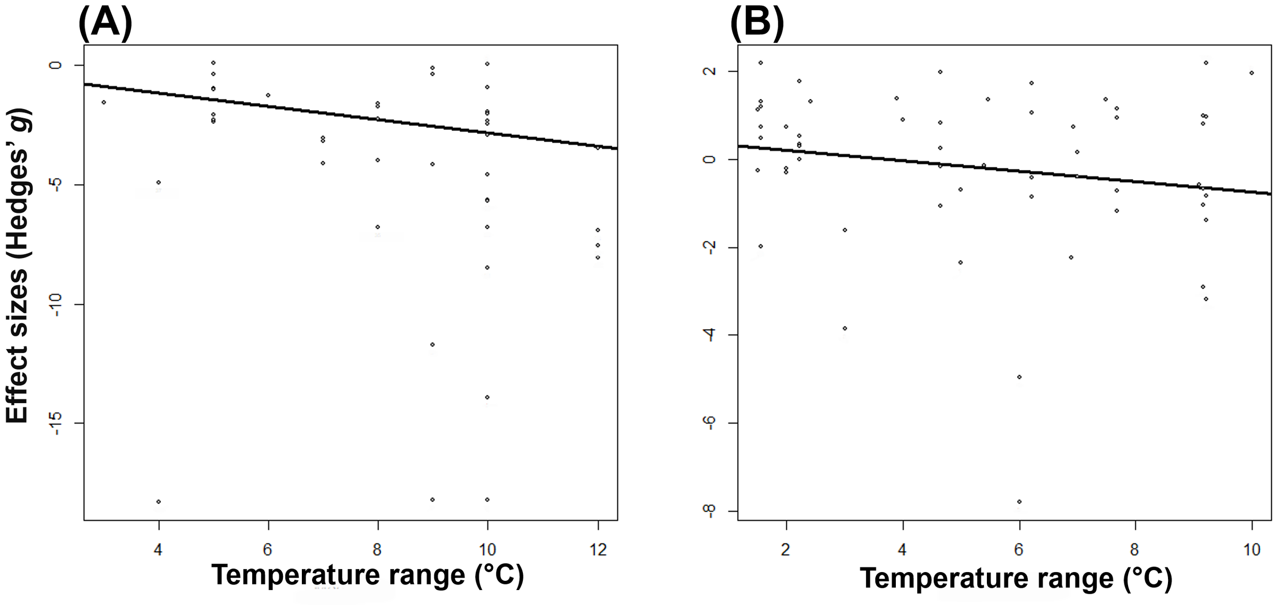We found that for only some studied traits moderators explained a significant proportion of their variation in Hedges’ effect sizes (g) (Table 2 and Figure 2). While effect sizes of nectar volume and sugar content did not differ significantly by any moderator, we found a significant effect of between-group heterogeneity (QMs) for nectar sugar concentration, pollen germination, pollen viability, and pollinator visits (Table 2). Specifically, nectar sugar concentration was influenced by study approach moderator, showing a significant decrease and increase in g values under greenhouse and field experiments, respectively (Figure 2A). Pollen germination and viability were influenced by temperature range moderator, where g values in crop species consistently decreased, but in wild plant type, they did not change (Figures 2B, C). Although g values in pollinator visits are being influenced by temperature range moderator (Table 2), no significant decrease was observed for any temperature range category (Figure 2D). The g values for pollen germination (z = -4.470, p = < 0.05) and pollinator visits (z = -5.976, p = < 0.05) were observed to significantly decrease as experimental temperature increases (Figures 3A, B).