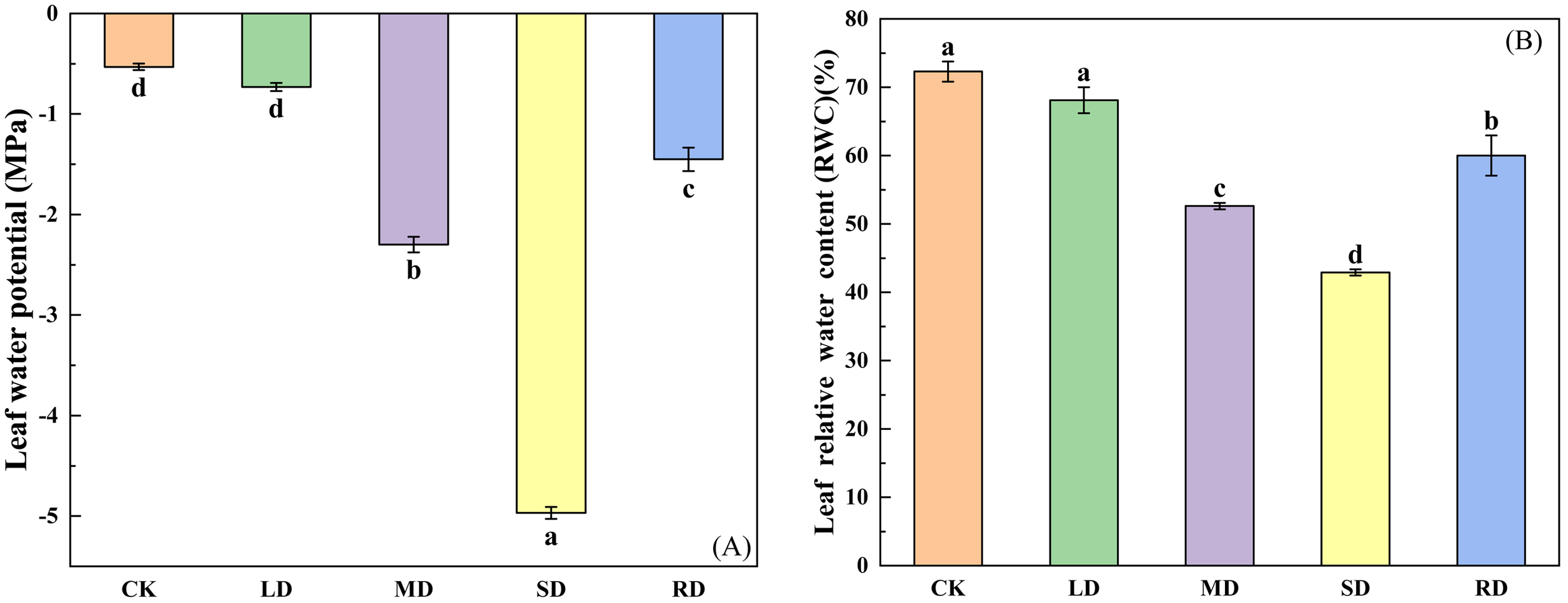 According to the soil relative water content (WCH) of 60% ~ 80%, 40% ~ 60%, and 20% ~ 40%, 30 seedlings were selected from 150 test seedlings as comparison (CK)、mild drought stress (LD)、moderate drought stress (MD), respectively. Finally, 60 plants with a WCH of 5% ~ 10% were selected. Among them, 30 plants were used as severe drought stress (SD), and the other 30 plants were replenished with water on August 6, 2023 and used as rehydrated treatment (RD).The assessment of each index began on August 8, 2023 and ended on August 10. Therefore, the drought stress time of CK, LD, MD, and SD was 7∼10 days, and the rehydrated lasts for 2∼5 days.