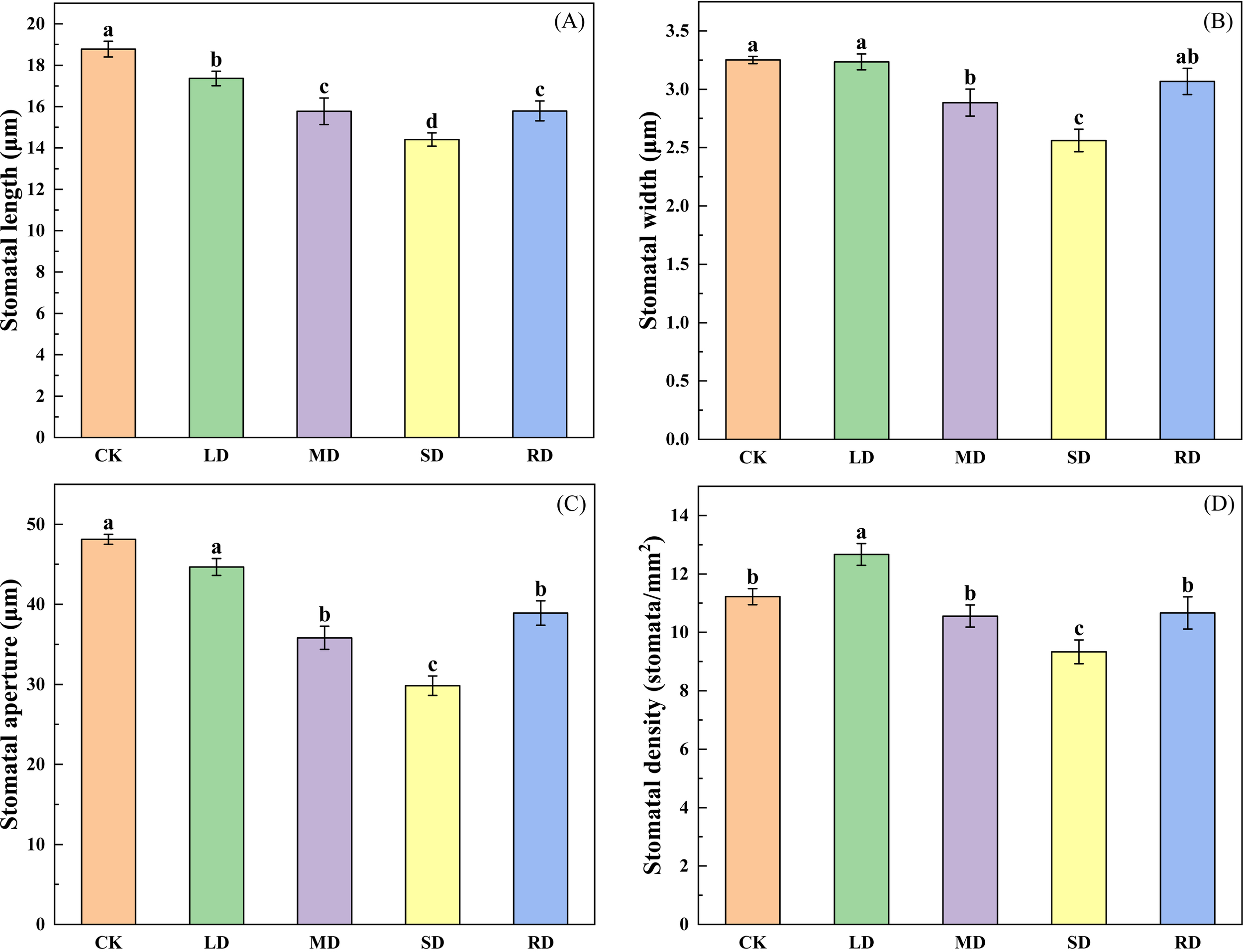 As can be seen in Figure 2, as the degree of drought increased, the stomatal opening length, stomatal opening width, stomatal aperture and stomatal density (except LD) of C. multiflorus leaves were significantly reduced. Under SD, the above-mentioned variables were reduced by 23.27%, 21.22%, 37.86%, 16.83% and 48.71%, respectively, compared to the control group (CK). However, After RD treatments (48 h), those variables were able to return to the state between LD and MD.