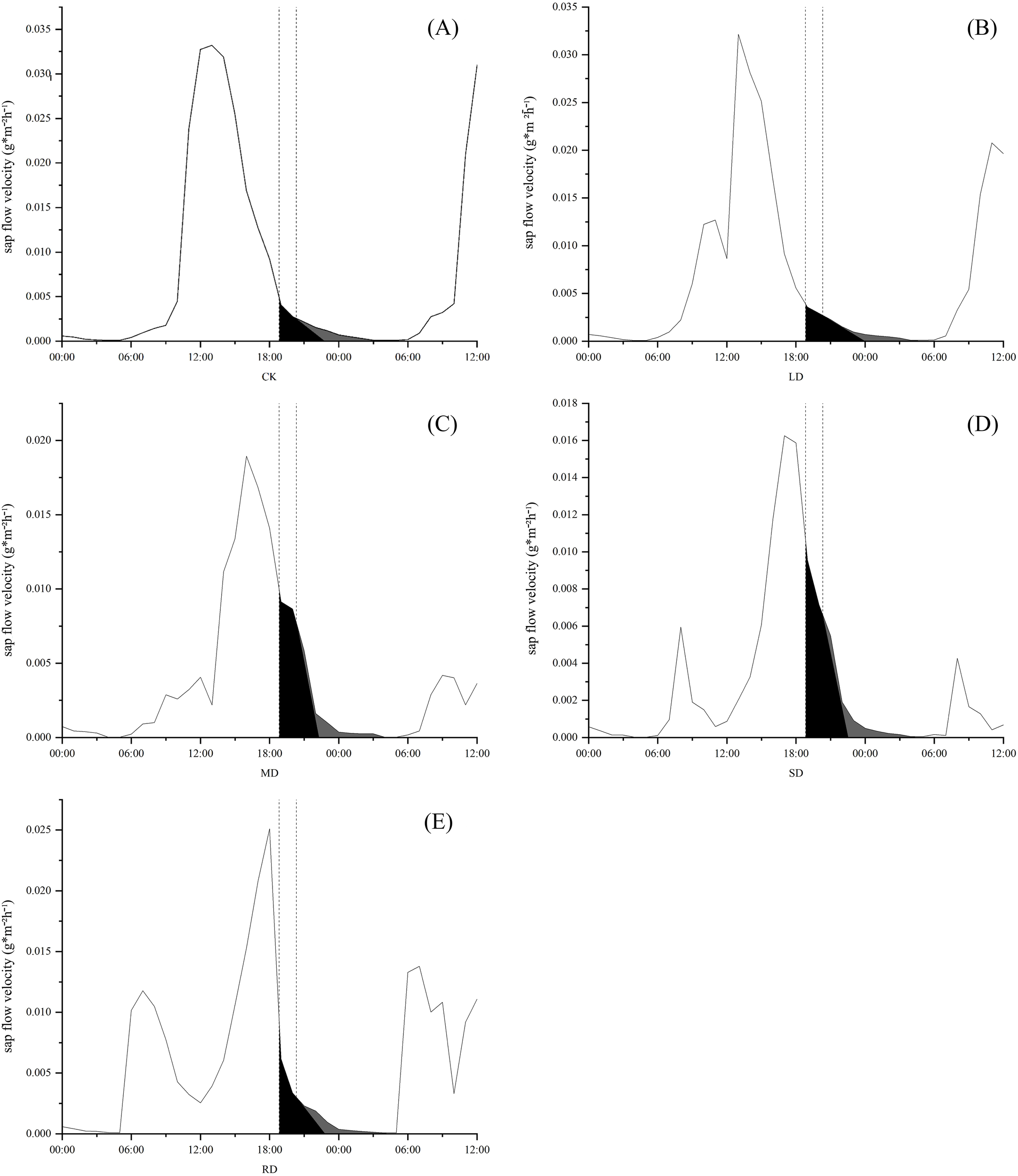 Distributional characteristics of sap flow of C. multiflorus under drought stress and rehydrated. The spacing between the two vertical gray dashed lines represents the lag time (80 minutes,18:50∼20:10) of sap flow activity and solar radiation changes. The black shaded area is nighttime stem rehydrated, and the gray shaded area is nighttime transpiration.