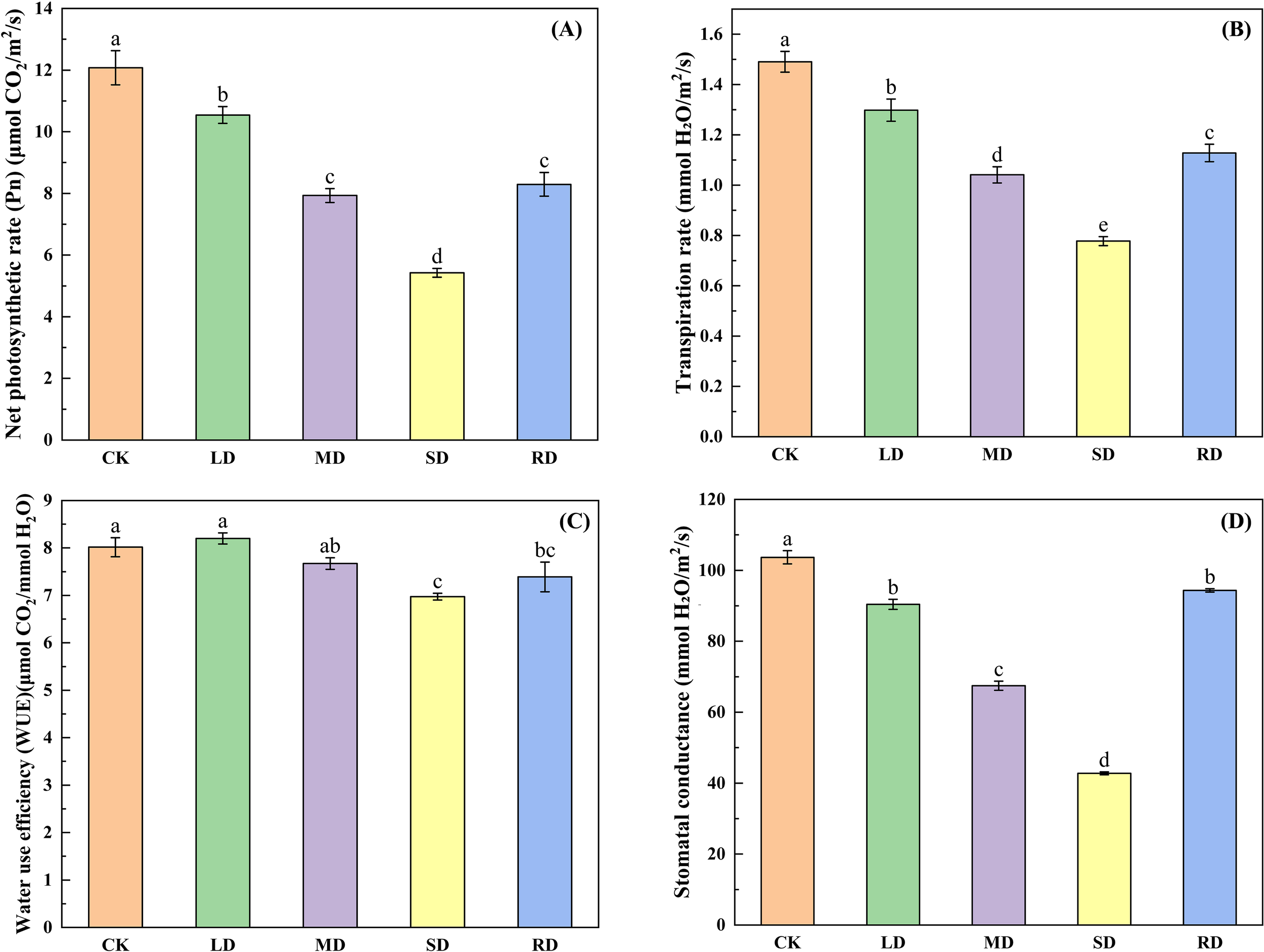 As can be seen from Figure 5, the , , and tended to decrease with increasing stress levels in all drought stress treatments, with decreasing by 12.73%, 34.32%, and 55.08% under LD, MD, and SD, respectively, compared with the CK. The decreased by 12.67%, 34.81% and 58.71%, while decreased by 12.52%, 29.84% and 47.60%, respectively, compared to the CK. The water use efficiency (WUE) under LD increased by 0.26% against the CK, while WUE under MD and SD decreased by 5.39% and 13.99% against the CK, respectively. After RD treatments, the , , , and WUE showed an increasing trend, which increased by 52.87%, 118.84%, 45.12%, and 6.43% compared to the CK.