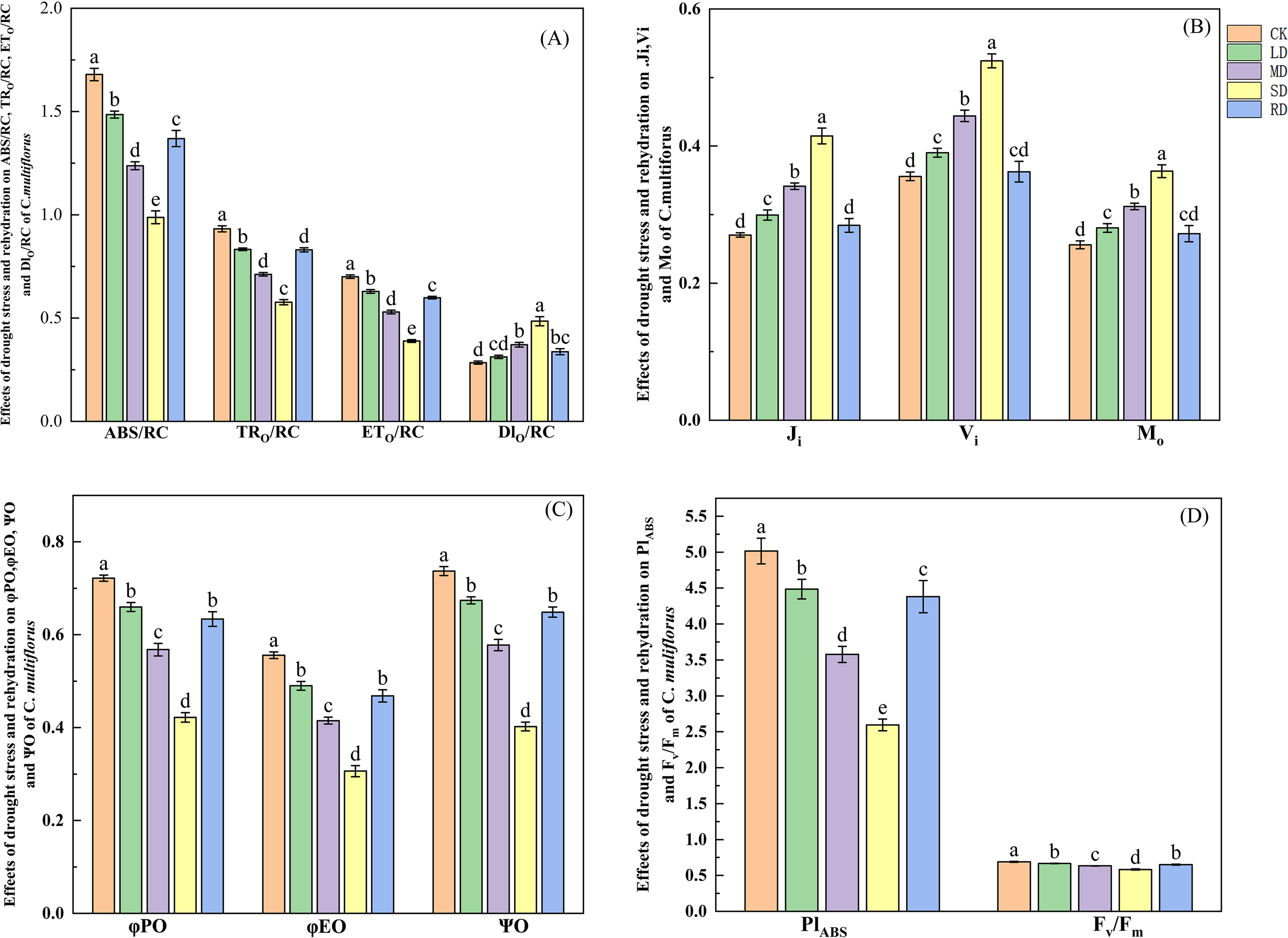 From Figure 6D, the decreased by 10.58%, 28.70% and 48.25% under LD, MD and SD, respectively, compared to CK. The decreased by 3.39%, 8.31% and 15.60%, respectively, compared to CK. After RD treatments, and increased by 68.80% and 11.65% respectively, compared to that of SD. It can be seen that the photosynthetic performance index of C. multiflorus leaves was more sensitive to drought stress than .