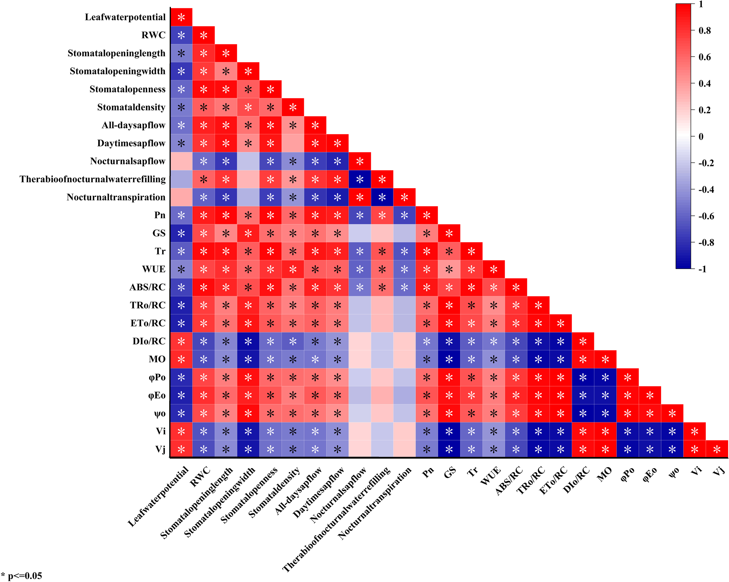 Significantly, a positive correlation was observed between the ratio of nocturnal water refilling and various plant parameters including leaf water potential, leaf relative water content, mean stomatal length, mean stomatal width, mean stomatal aperture, and mean stomatal density. Additionally, there was a notable positive correlation between the ratio of nocturnal water refilling and all-day as well as daytime sap flow. Interestingly, a significant negative correlation was found between the ratio of nocturnal water refilling and nocturnal sap flow. The ratio of nocturnal water refilling was positively correlated with the photosynthetic characteristics of , stomatal conductance, , WUE, , , , , , and negatively correlated with , , and .