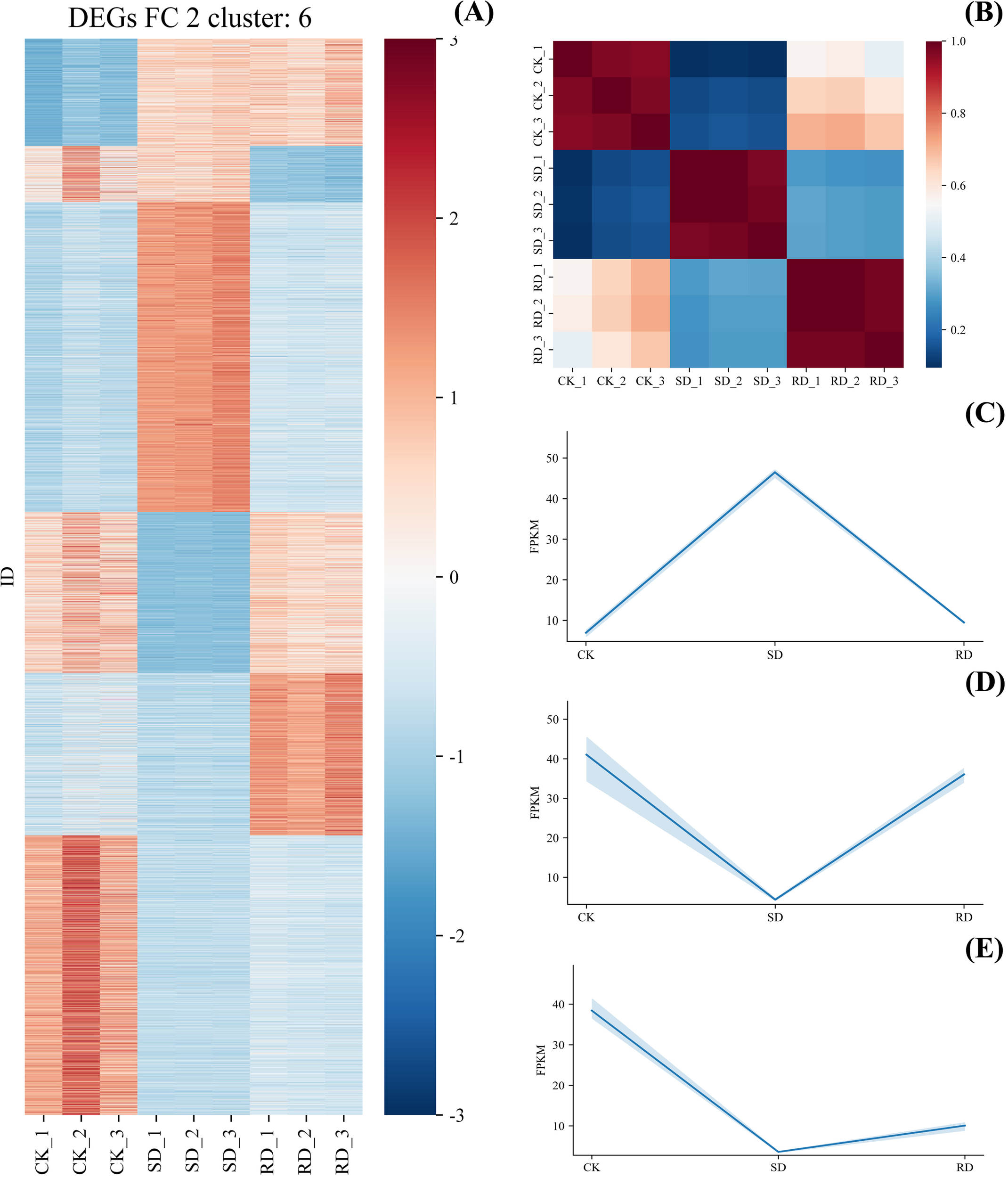 Spearman correlation analysis and DEGs cluster analysis of RNA expression in (C) multiflorus leaves under drought stress and rehydrated. (A) DEGs cluster analysis; (B) Spearman correlation analysis; (C) linear fitting of the second category; (D) linear fitting of the third category; (E) linear fitting of the fifth category.
