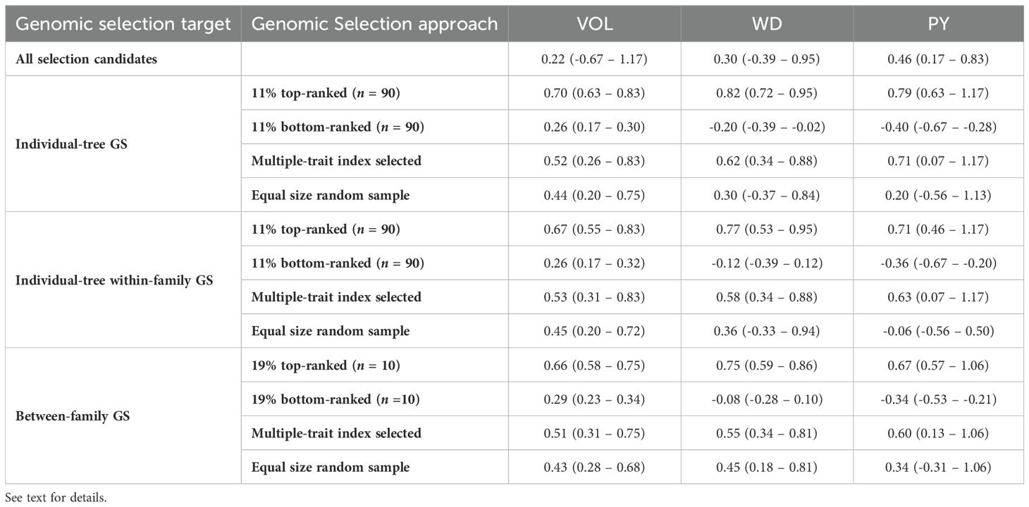 To evaluate the efficiency of genomic selection (GS) for the different traits, selection targets and selection criteria, the average GEBVs were calculated for the trees or families selected by the different GS approaches tested. In the first assessment the comparison was against an equivalent number of trees or families selected at random (Table 4). When the entire selection candidate population was considered, the average GEBVs was 0.22 for VOL, 0.30 for WD and 0.46 for PY. In the individual-tree GS approach and focusing on the top 11% (n = 90) genomically ranked trees, significantly higher average GEBVs were observed for all three traits compared to the random sample of candidates. Specifically, the average GEBVs was 0.70 for VOL, 0.82 for WD and 0.79 for PY compared to 0.44, 0.30 and 0.20 for the corresponding random samples. The average GEBV were slightly lower when GS was practiced based on a selection index (0.52 for VOL, 0.62 for WD, and 0.71 for PY). A similar result was observed for the second selection approach when the average GEBVs of the 11% top and bottom-ranked trees within each one of the top 10 families were considered. For the third GS approach, the family average GEBVs for the 19% (n = 10) top-ranked families, were also higher than the average GEBVs for an equivalent set of random families, but the differences were slightly smaller than those observed for individual-tree selection. Overall, these results show that the implementation of GS with any of the three selection approaches would result in considerably higher efficiency compared to a random sampling of an equivalent number of individual trees or families.