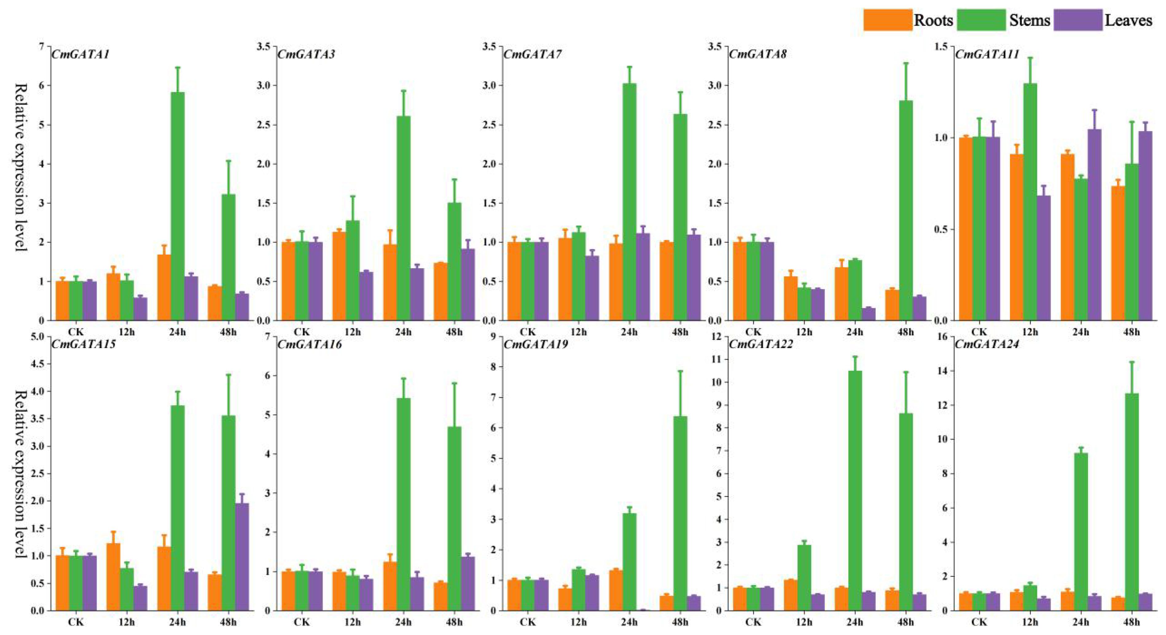 Figure 7. Fluorescent quantitative expression bar graph of CmGATA genes after infection by Fusarium wilt. Yellow bars represent roots, green bars represent stems, and purple bars represent leaves.