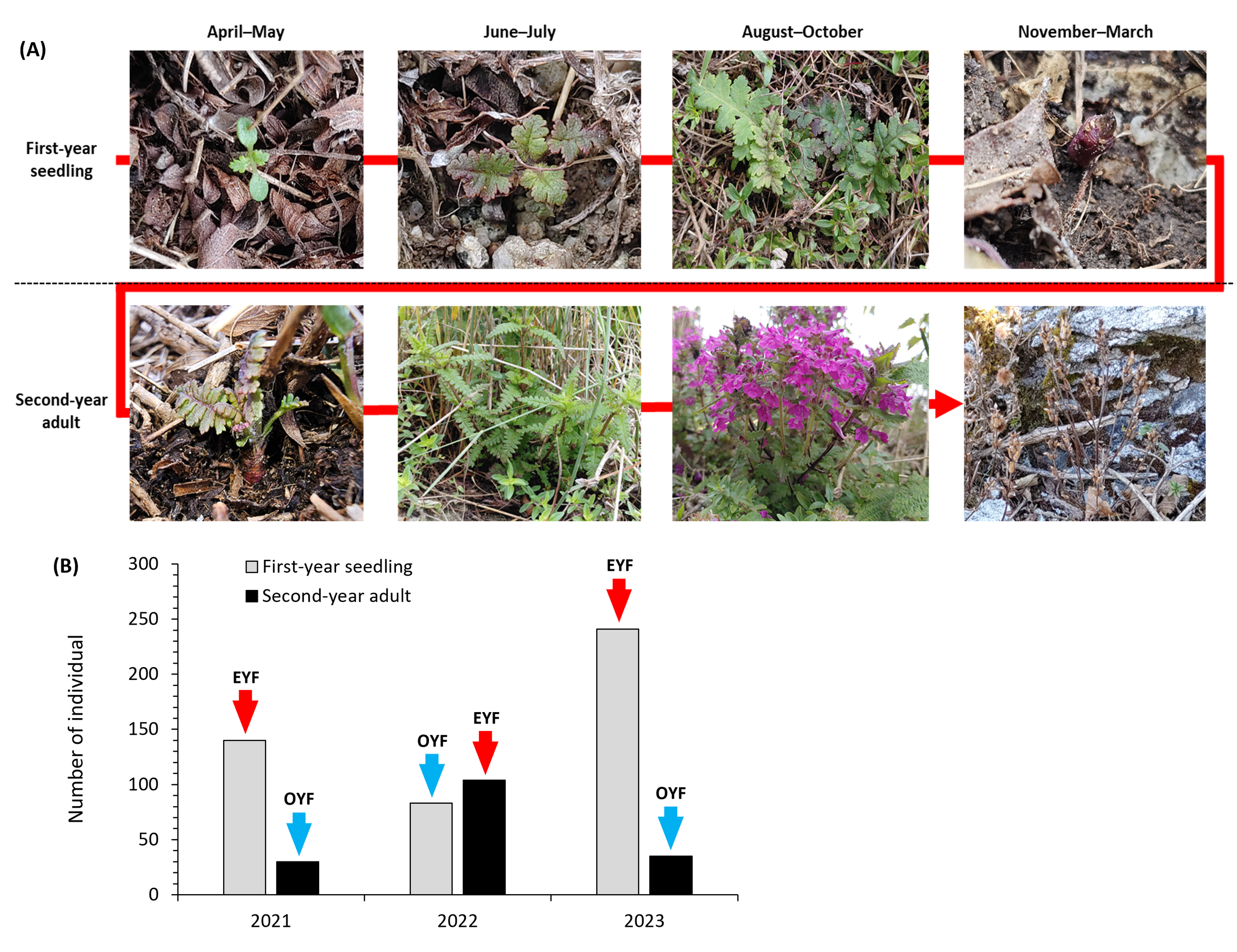 (A) Summary of the strict biennial lifecycle of Pedicularis hallaisanensis and (B) number of first-year seedling and second-year adult of P. hallaisanensis individuals in the study area. Arrows above the bars in (B) indicate odd-year-flowering (OYF) and even-year-flowering (EYF) P. hallaisanensis.