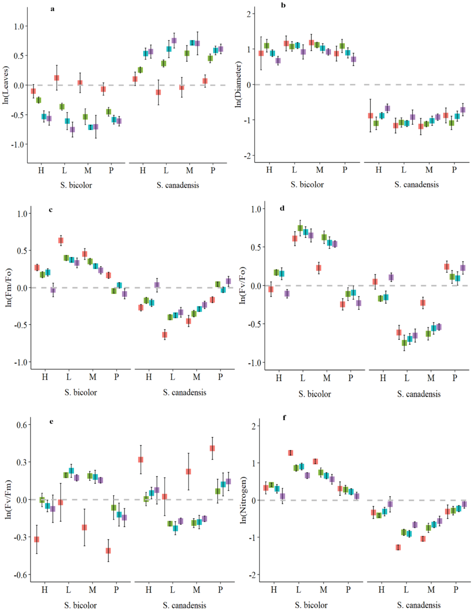 Relative number of leaves (A), stem diameter (B), chlorophyll fluorescence (C-E), and leaf nitrogen (F) characteristics of S. canadensis and S. bicolor under varied invasion levels and available nitrogen forms. Red color, control; green color, ammonical N; blue color, both nitrogen forms; purple color, nitrate N; H, high invasion level; L, low invasion level; M, medium invasion level; P, no invasion.
