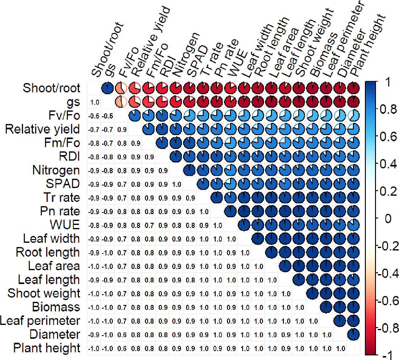 Pearson’s correlation coefficient determines the linear relationship between different datasets. A strong Pearson correlation coefficient was observed between Pn rate (0.98), plant height (0.98), and plant diameter (0.98; Figure 5). Plant dry biomass also showed a strong correlation with plant height (0.98), diameter (0.98), Pn rate (0.98), Tr rate (0.97), leaf area (0.99), and shoot weight (0.99). However, a weak correlation was observed between biomass and fluorescence parameters (0.67-0.82; Figure 5). The leaf N content had a strong correlation with RDI, SPAD, and relative yield, and negative correlations for gs and shoot-to-root ratio were observed against all the parameters (Figure 5).