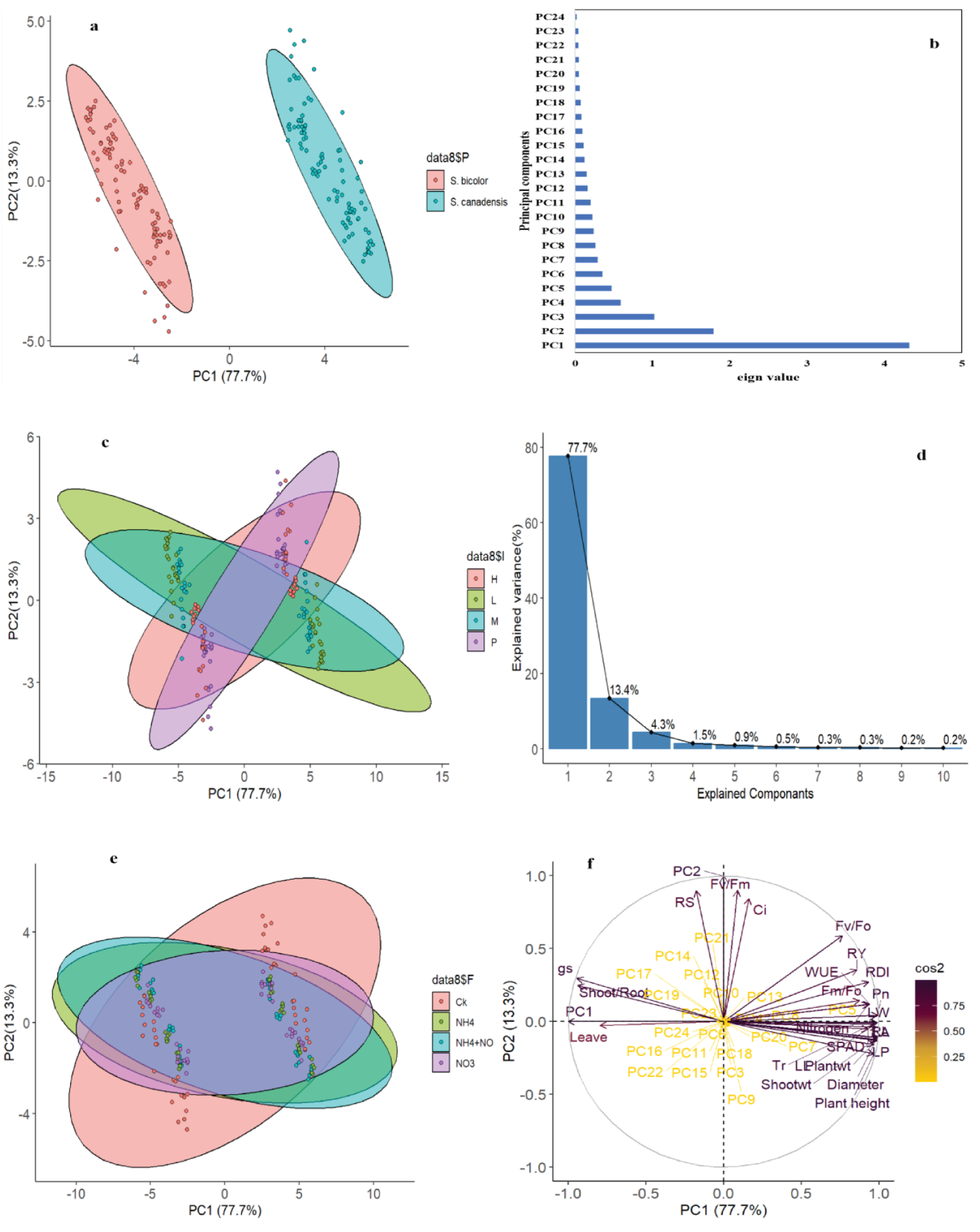 Principal component analysis of S. canadensis and S. bicolor under varied invasion levels and available nitrogen forms. Biplot of plant species (A), eigenvalue for principal component (B), biplot for invasion levels (C), variance distribution (D), biplot for available nitrogen forms (E), and principal component plot (F).