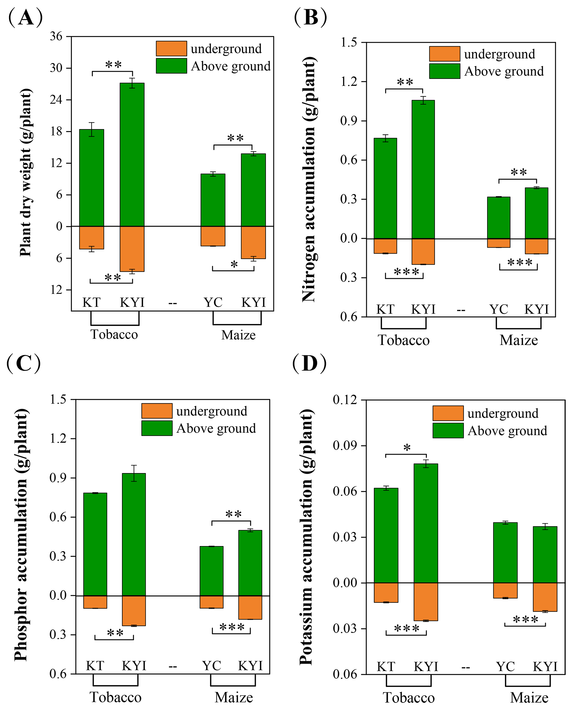 Effects of Intercropping on the Growth of Tobacco and Maize. (A) Biomass; (B) Nitrogen accumulation; (C) Phosphor accumulation; (D) Potassium accumulation. *indicates significant differences between the two groups (*p < 0.05, **p < 0.01, ***p < 0.001, independent-samples t-test; n=6). The same as below.