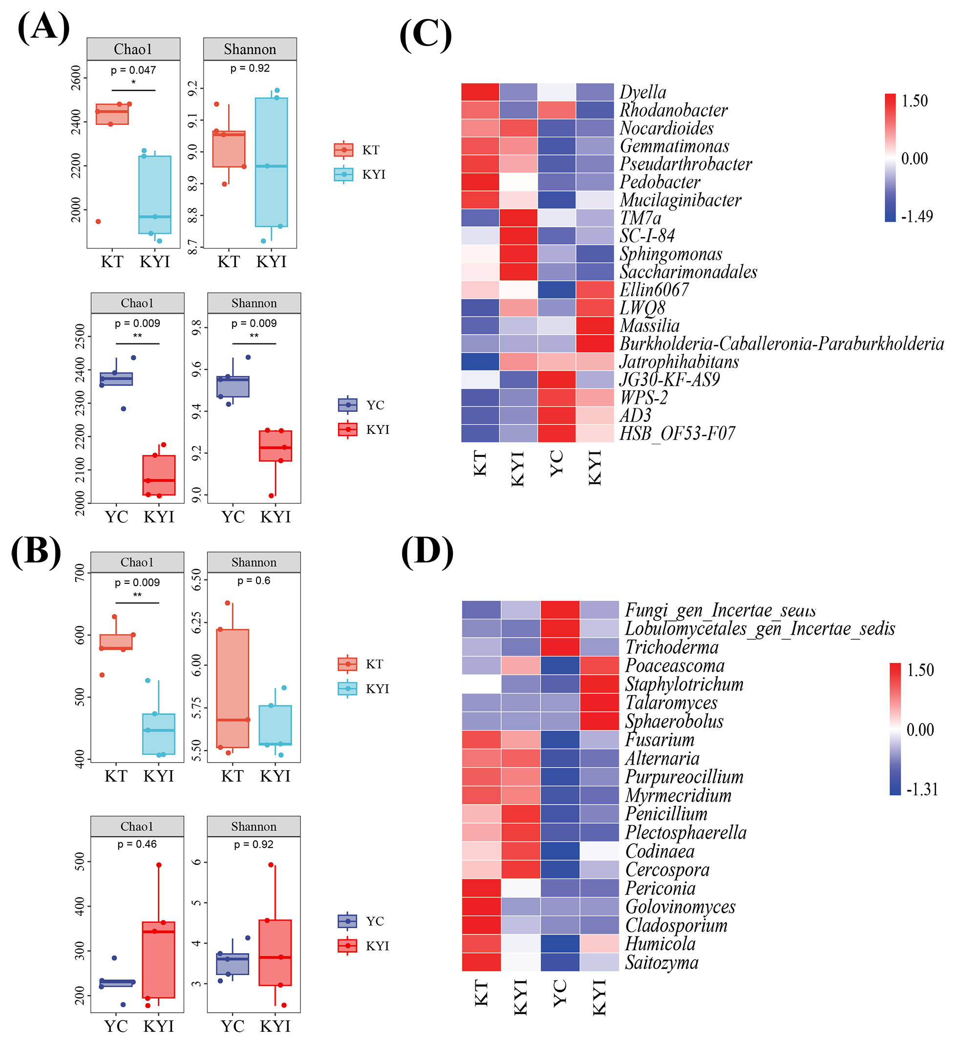 Differences in the structure of microbial communities at different treatments. (A) Rhizosphere soil bacterial diversity; (B) Rhizosphere soil fungal diversity; (C) Heat map of relative abundance of dominant bacteria; (D) Heat map of relative abundance of dominant fungi. Alpha diversities of bacteria and fungi in the rhizosphere soil at different treatments, as well as the relative abundances of the top 20 bacterial and fungal species. *indicates significant differences between the two groups (*p < 0.05, **p < 0.01, t-test; n=5). The same as below.
