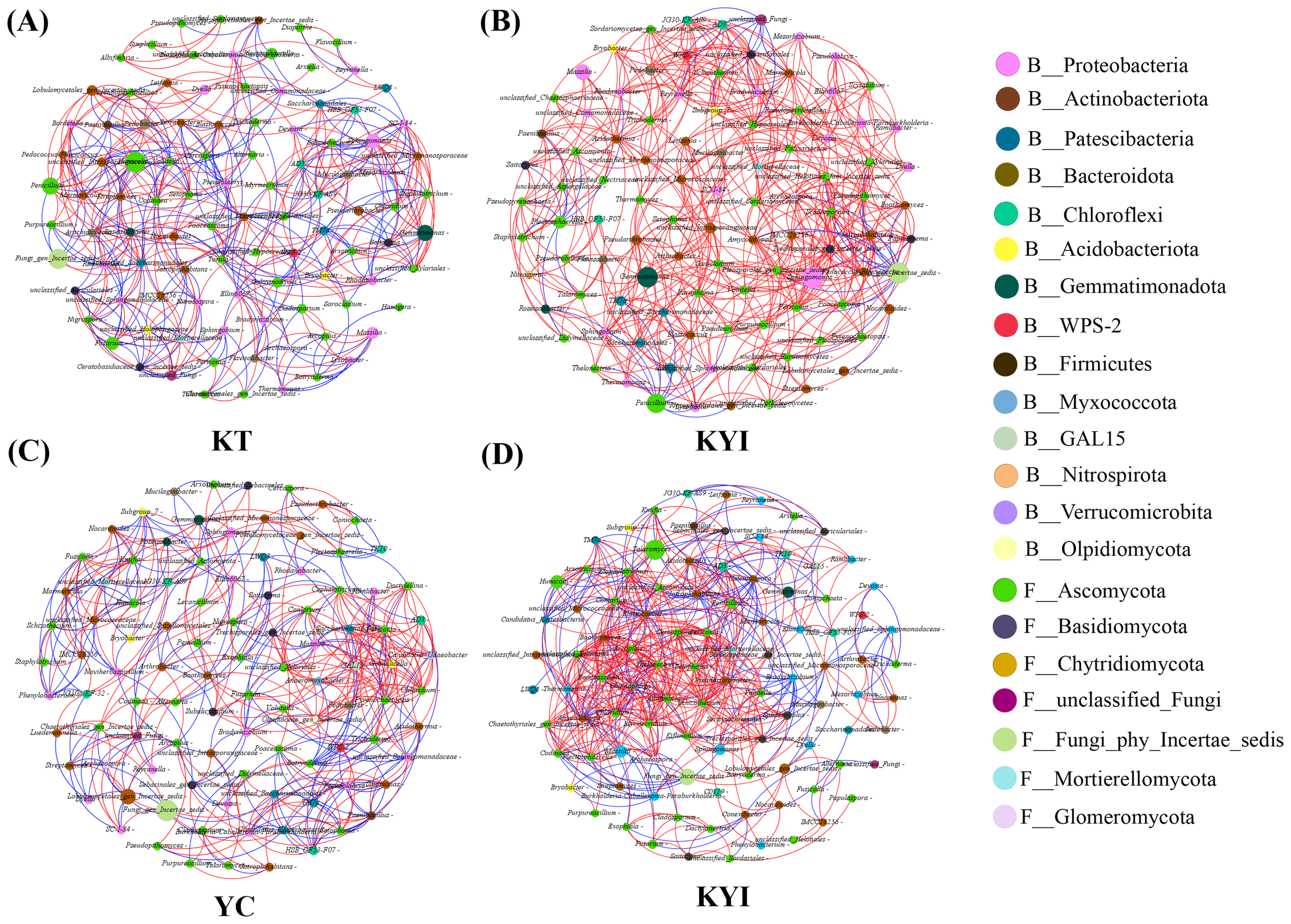 Co-occurrence network of bacterial and fungal communities in the rhizosphere soil of tobacco and maize. (A) Single cropping of flue-cured tobacco; (B) Intercropping of flue-cured tobacco; (C) Single cropping of maize; (D) Intercropping of maize. Each node in the network represents a bacterial or fungal genus, and the connection indicates a strong positive correlation with statistical significance (p < 0.05) (red, Spearman’s r > 0.7) or negative correlation (blue, Spearman’s r < - 0.7). Nodes of the same color belong to the same gate, and the thickness of each connection between two nodes is related to the Spearman correlation coefficient, r > 0.7 or < -0.7.