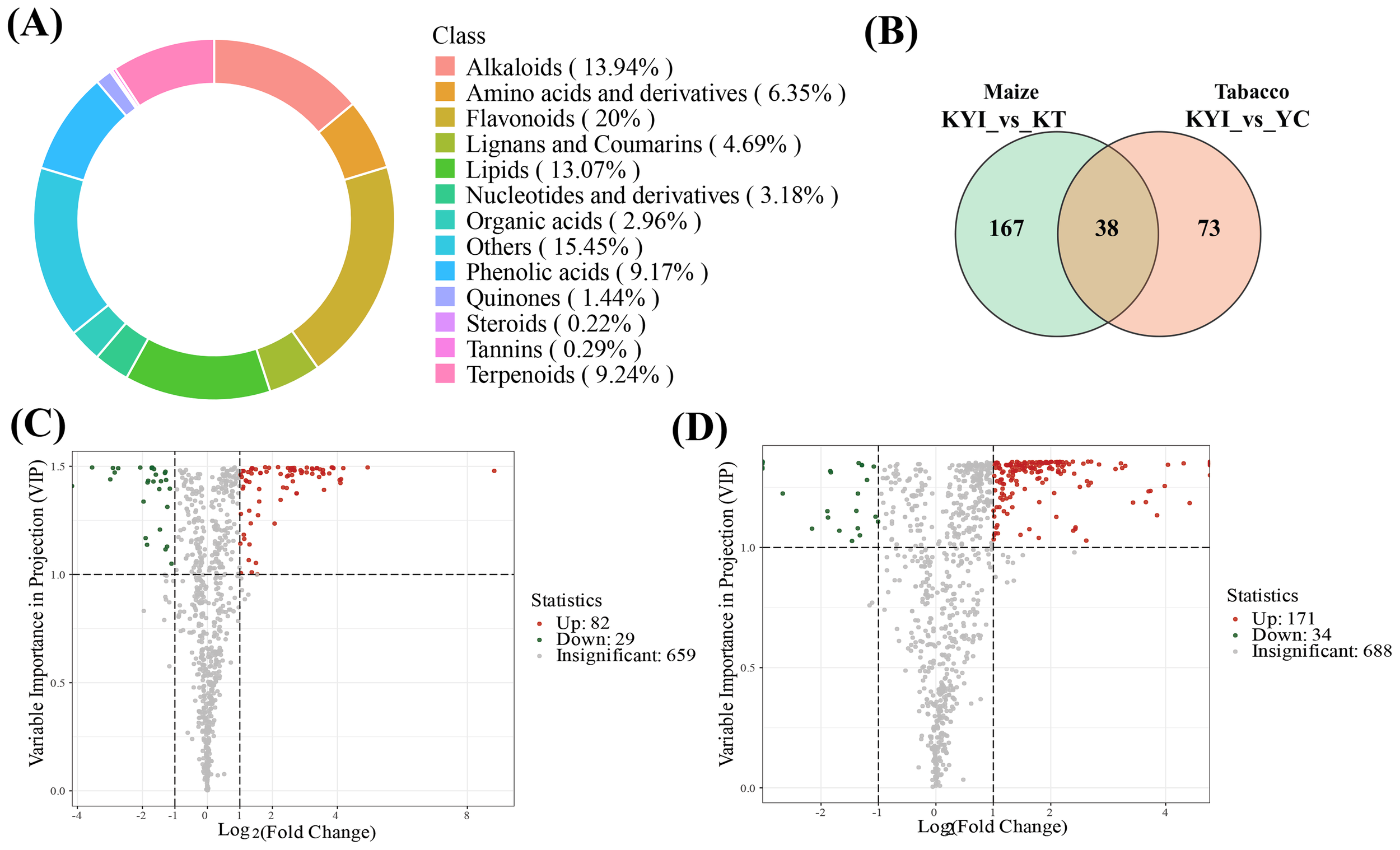 Changes of different metabolites in rhizosphere soil. (A) Classification of identified metabolites in rhizosphere soils; (B) Venn maps of differential metabolites in rhizosphere soils of tobacco and maize under mono-cropping and intercropping systems; (C) Volcanic maps of differentiated metabolites in maize rhizosphere soil (YC vs KYI); (D) Volcanic maps of differentiated metabolites in maize rhizosphere soil (KT vs KYI). The panels (C, D) are drawn based on the average of three repetitions.