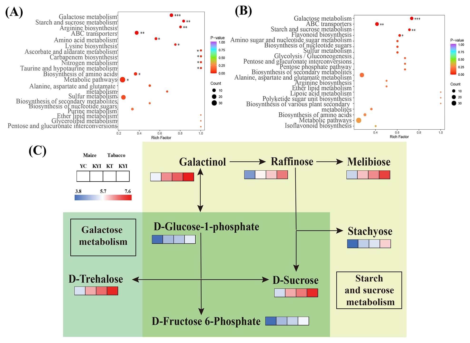 The significantly different metabolites were annotated using the KEGG database (https://www.kegg.jp/). We identified the top 20 pathways with the highest levels of enrichment in both control groups. In the comparison between YC and KYI, Galactose metabolism, Starch and sucrose metabolism, Arginine biosynthesis and ABC transporter were significantly enriched (Figure 5A). In the comparison between KT and KYI, Galactose metabolism, ABC transporter, Starch and sucrose metabolism, and Flavonoid biosynthesis were significantly enriched (Figure 5B). In the intercropping mode, the changes of carbohydrate metabolism pathways were consistent between the two crops, the metabolite content in all pathways was significantly increased and 8 different metabolites enriched in galactose metabolism pathway and starch and sucrose metabolism pathway were compared and analyzed (Figure 5C), and it was found that they were significantly increased in the rhizosphere soil of the two crops in the intercropping mode. D-Glucose-1-phosphate, D-Sucrose, and D-Fructose-6-Phosphate are the core metabolites in both pathways. The results showed that intercropping could increase the content of energy metabolites in rhizosphere soil.