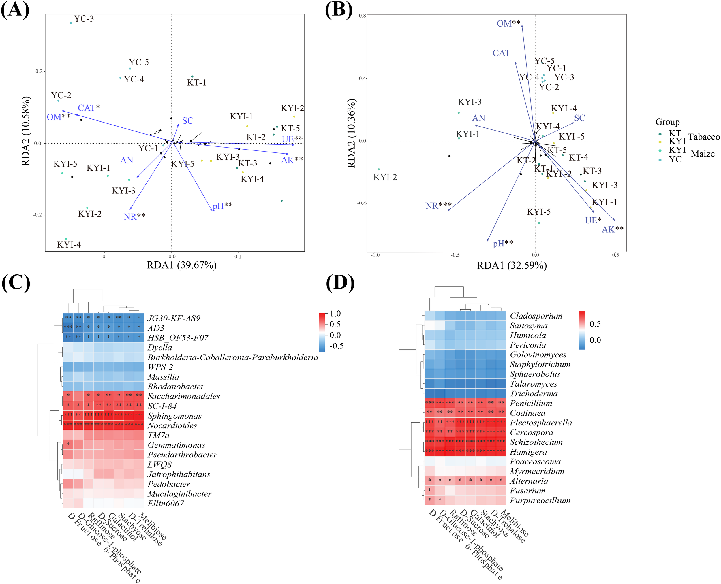 Combine analysis. (A) Redundancy analysis of soil bacteria and soil environmental indicators; (B) Redundancy analysis of soil fungi and soil environmental indicators; (C) Correlation analysis between key metabolites and the abundance of dominant bacteria; (D) Correlation analysis of key metabolites with the abundance of dominant fungi. * means p ≤ 0.05, ** means p ≤ 0.01, *** means p ≤ 0.001.