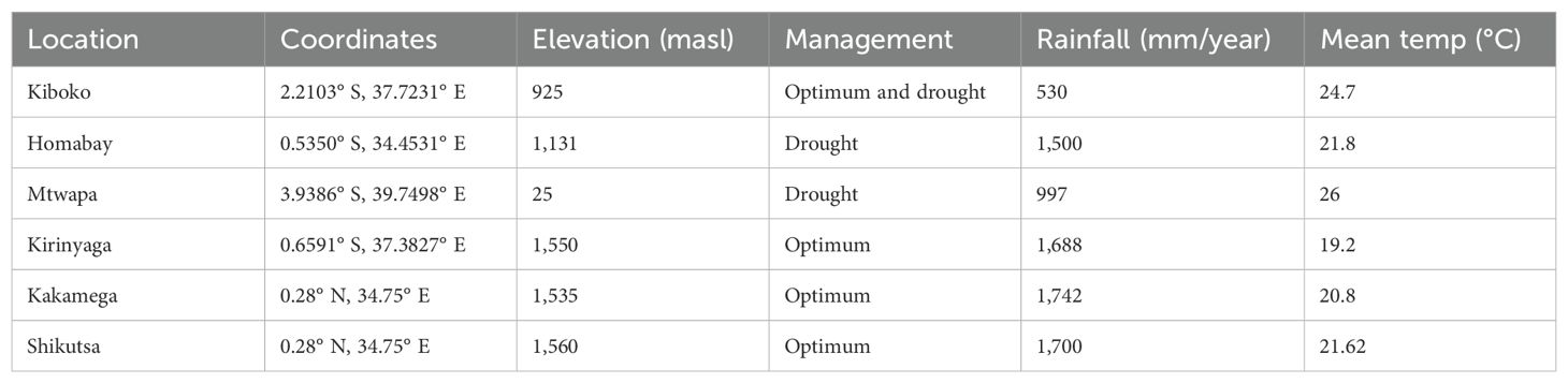 The testcrosses were evaluated in Kenya at four locations under optimum management (Kakamega, Kiboko, Kirinyaga, and Shikutza) and at three locations (Kiboko, Homabay, and Mtwapa) under drought stress conditions (Table 1). Drought stress experiments were conducted in the off season where it does not rain during cropping period. The drought stress fields are irrigated with a drip irrigation system. Irrigation was applied twice weekly for 3 to 5 h depending on the potential evapotranspiration (Trachsel et al., 2016). Irrigation of the trials was stopped at ~750 GDD after planting (2 weeks before the anticipated date of flowering) to induce drought stress (Trachsel et al., 2016; Ertiro et al., 2017). The well-watered or optimum trials were conducted in the main season under rainfed conditions. The trials were also supplemented with irrigation throughout the growth cycle to avoid drought stress. The management of drought stress experiment and phenotyping were according to the procedures outlined in the drought phenotyping protocols by CIMMYT (Zaman-Allah et al., 2016; Zaidi, 2019).