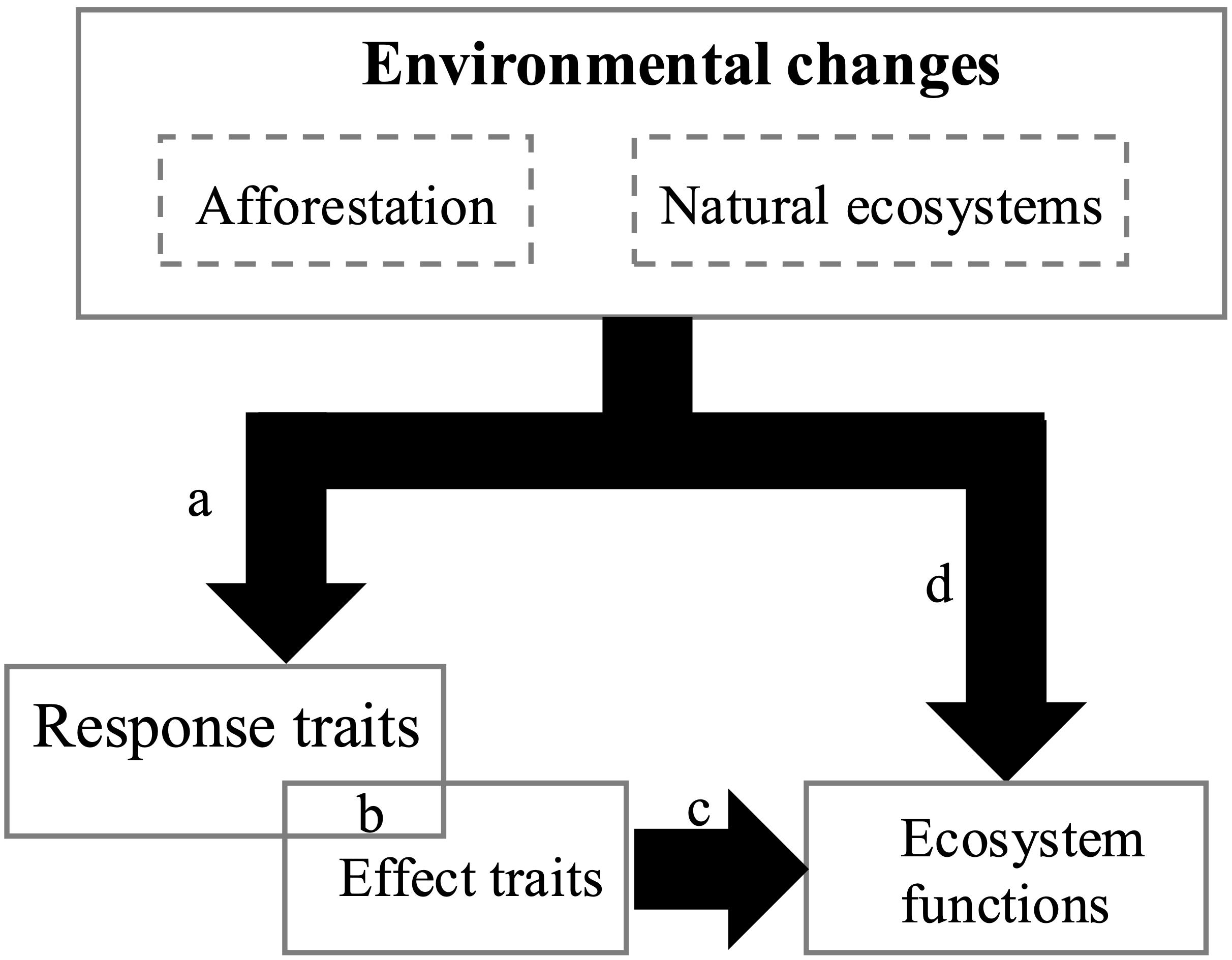 Understanding how community functional structure determines ecosystem function is a major goal of restoration ecology (Yang et al., 2019). Manipulating community structure to achieve functional goals is a key aspect of restoring degraded ecosystem (Laughlin, 2014). We present, to our knowledge, the first response–effect trait framework that integrates R. pseudoacacia plantations and natural ecosystems. Using quantitative trait-based approaches to explain community structure and ecosystem function yields more generalizable predictable outcome (Cadotte, 2017). First, we used natural ecosystems as a reference to investigate the effects of afforestation on community structure and moisture regulation in different vegetation zones. Afforestation alters the relationship between community structure and soil moisture, indicating that it has an impact on ecosystem. Second, we detected differences in trait correlations between natural ecosystems and R. pseudoacacia plantations, indicating that afforestation affects the community assembly and, consequently, ecosystem function. This finding provides important implications for understanding the relationship between community structure and ecosystem function. Finally, we used a mixed effects model to construct a response–effect trait framework for both ecosystems, which can support ecosystem management and restoration efforts, ultimately resulting in the desired ecosystem functions.