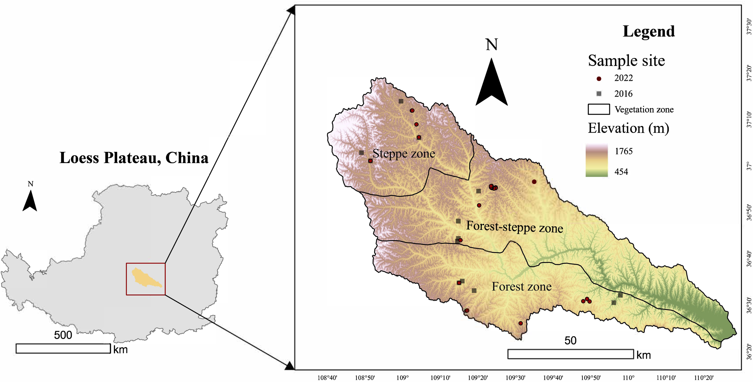 The study was conducted across the loess hilly-gullied landscape of Yanhe River Basin (YRB), which is located in the middle area of the Loess Plateau of China (latitude, 36°21′–37°19′N; longitude, 108°38′–110°29′E). It covers an area of 7,725 km2 (Figure 2), with annual temperature ranging from 8.8°C to 10.2°C and annual precipitation ranging from 450 mm to 500 mm over the last decade. The spatial and temporal variation of precipitation and temperature in YRB is obvious, which affects regional vegetation distribution. The dominant vegetation types are forest, forest–steppe, and steppe. The forest zone is dominated by Quercus mongolica, the forest–steppe zone by Periloca sepium and Buddleja alternifolia, and the steppe zone by Stipa bungeana, Bothriochloa ischaemum, Poa sphondylodes, and Cleistogenes caespitosa. YRB is one of the areas with the highest rate of soil and water loss on the Loess Plateau, with the soil and water loss area accounting for 80% of the basin area. The most commonly planted tree is R. pseudoacacia.