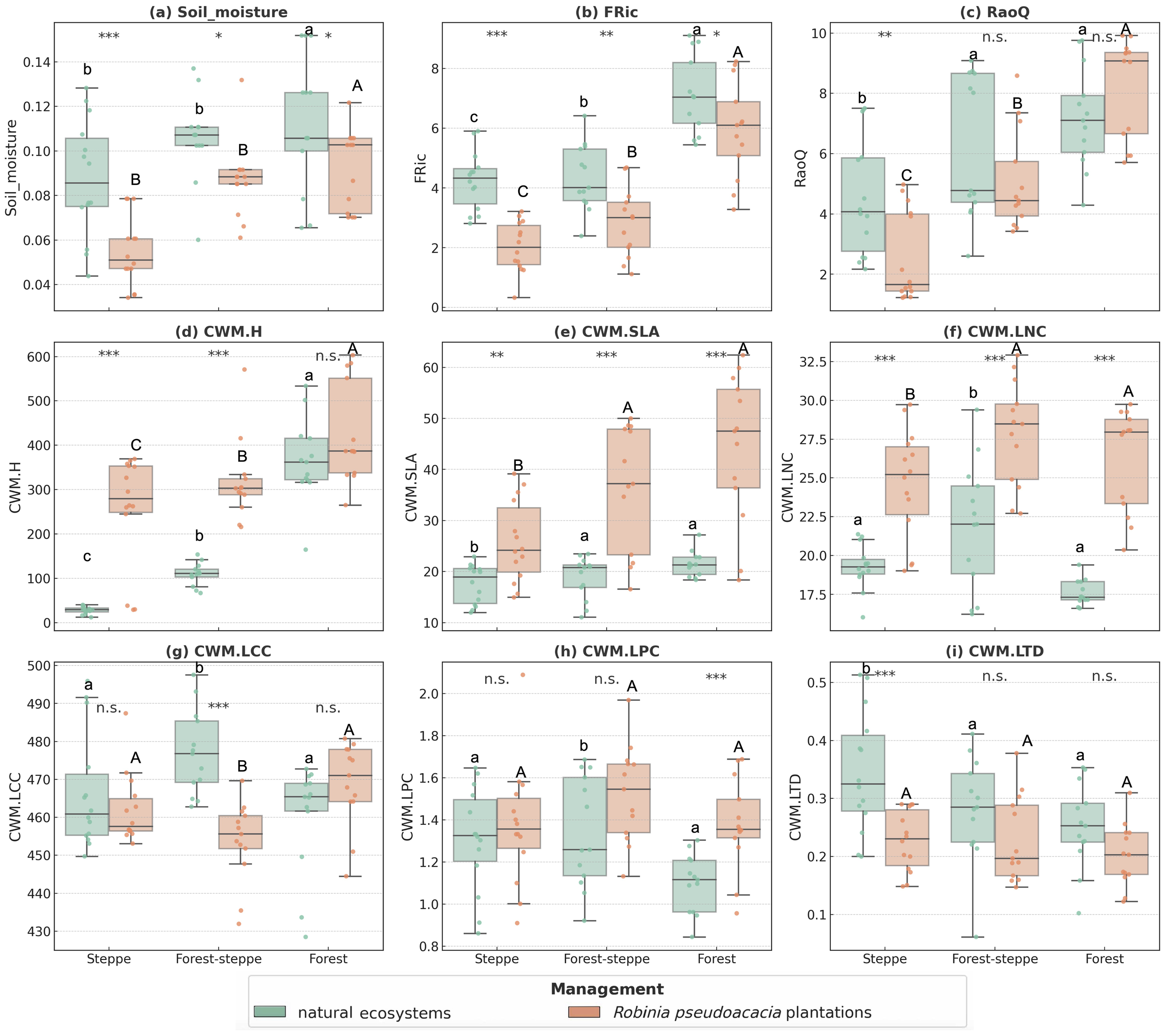 In comparison to natural ecosystems, R. pseudoacacia plantations had significantly lower soil moisture in all vegetation zones (p<0.05) (Figure 3A). In terms of functional diversity, we found that FRic of natural ecosystems are higher than that of R. pseudoacacia plantations in all zones, and RaoQ of natural ecosystems are higher in the steppe. Moreover, CWM.SLA and CWM.LNC are smaller in natural ecosystems than in R. pseudoacacia plantations in all zones; CWM.LCC is higher in natural ecosystems than in R. pseudoacacia plantations in the forest–steppe, CWM.LPC is smaller in natural ecosystems than in R. pseudoacacia plantations in the forest, and CWM.LTD is bigger in natural ecosystems than in R. pseudoacacia plantations in the steppe.