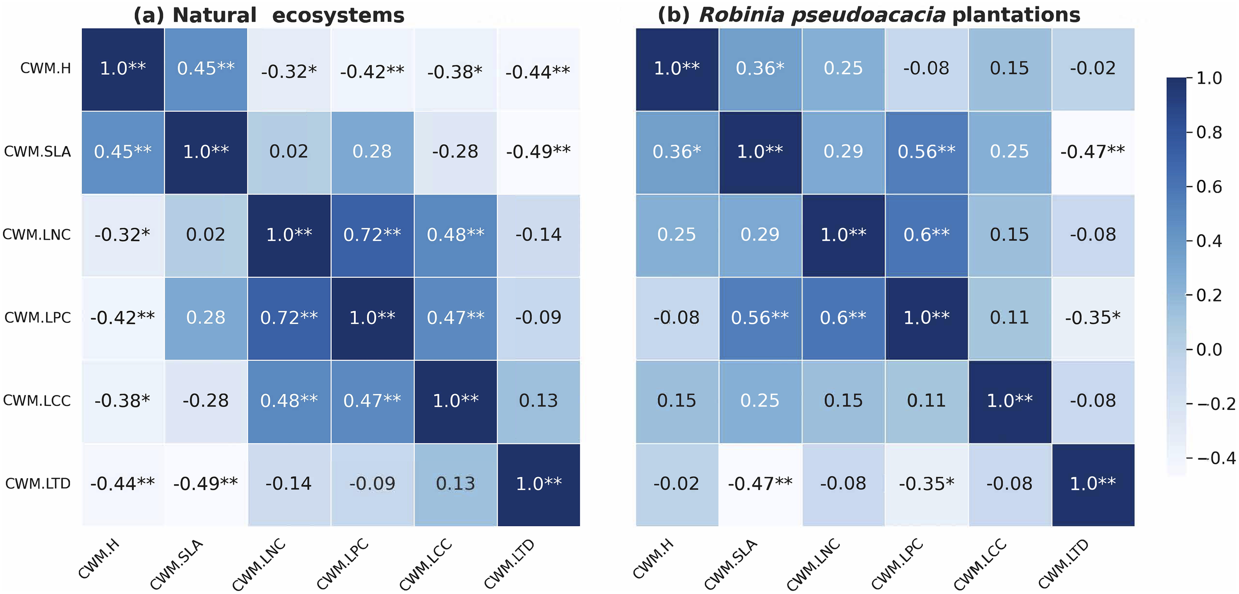 Correlogram of CWM metrics Pearson correlation. Correlation coefficients are shown in color and significance is marked. * and ** indicate the difference are significant at P < 0.05 and P < 0.01. Panels (A, B) represent the natural ecosystems and the Robinia pseudoacacia plantations, respectively.
