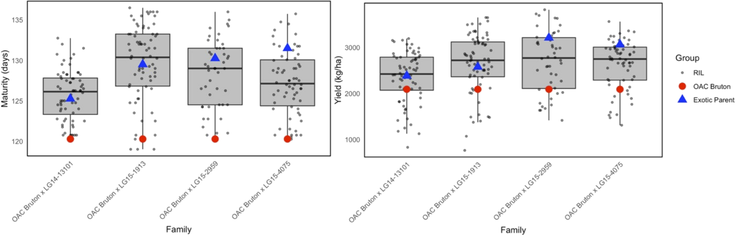 Boxplots of best linear unbiased estimate (BLUE) values for maturity and yield in four families created from crossing elite OAC Bruton (red) to four exotic lines: LG14-13101, LG15-1913, LG15-2959, and LG15-4075. The box spans the interquartile range in which 50% of recombinant inbred line (RIL) values lie, and the horizontal line in each box represents median value of RILs.