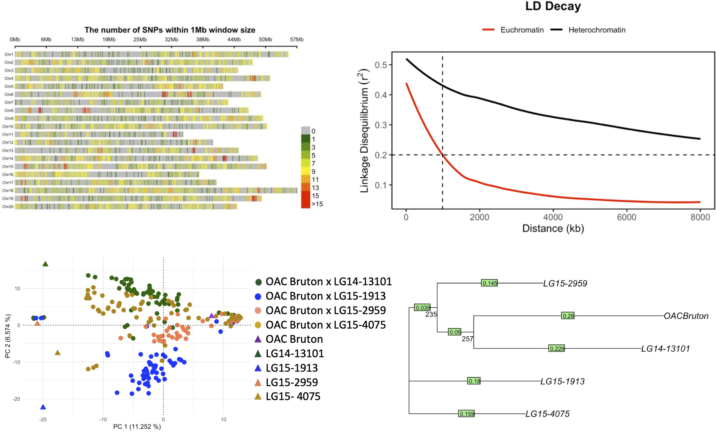 (A) Distribution of 5,213 single-nucleotide polymorphisms (SNPs) across 20 chromosomes in the NAM panel composed of four elite × exotic crosses (n = 253). (B) Linkage disequilibrium (LD) decay in heterochromatin and euchromatin regions where dashed line represents LD decay distance at the background r2 threshold of 0.2. (C) Principal component analysis (PCA) plot of first two principal components (PCs). (D) Neighbor-joining tree of parental lines OAC Bruton, LG14-13101, LG15-1913, LG15-2959, and LG15-4075. Bootstrap values (1,000 replicates) are shown below the branches.