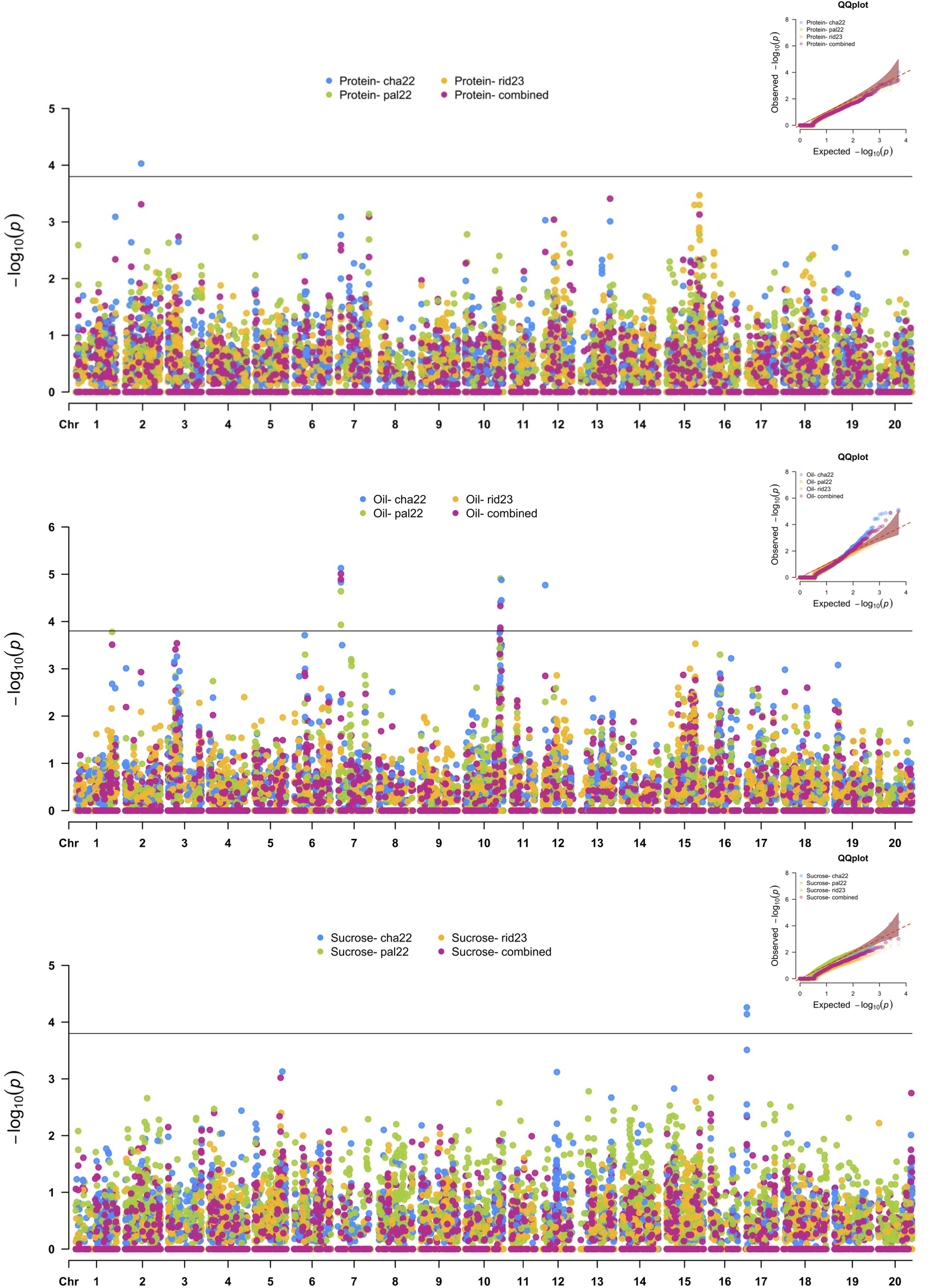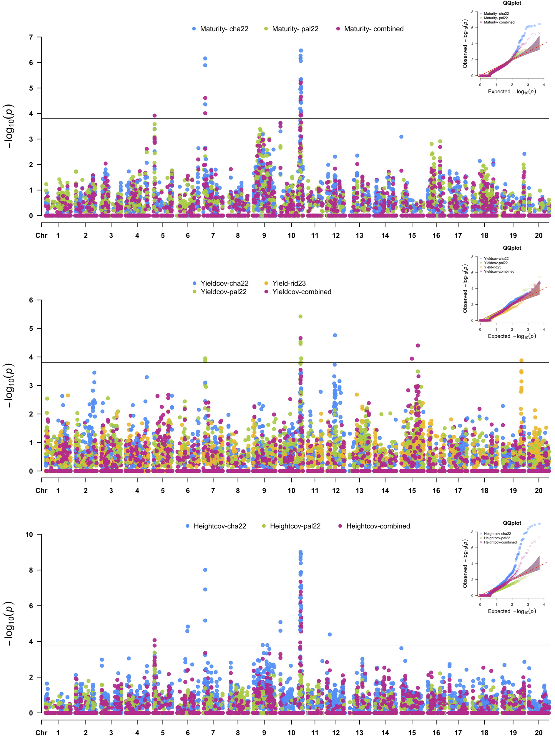 Manhattan plots of nested association mapping (NAM) analysis for maturity, seed yield, and height across three environments, Chatham 2022, Palmyra 2022, and Ridgetown 2023, as well as the combined environment analysis. Significant single-nucleotide polymorphisms (SNPs) were determined by the false discovery rate (FDR) 0.05 threshold (3.8 × 10−5) denoted by the horizontal line.