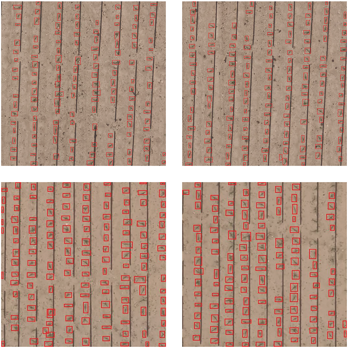The UAV images of the area were processed using Pix4Dmapper version 4.4.9 (Pix4D SA, Lausanne, Switzerland) image stitching software. However, due to the considerable dimensions of the images and the limited extent of the early maize seedlings, direct training and detection proved to be impractical. Following the removal of irrelevant areas, the images of the research area were automatically cropped to a size of 512 × 512 pixels. A total of 1,233 early maize seedlings images were obtained. All early maize seedlings images were randomly divided into three sets: the training set, the validation set and the test set, in a ratio of 7:2:1. In order to assess the model’s ability to count at varying heights, 24-meter-high early maize UAV images were incorporated exclusively into the test set. Representative images from the Early Maize Seedling Detection (EMSD) dataset are presented in Figure 2.