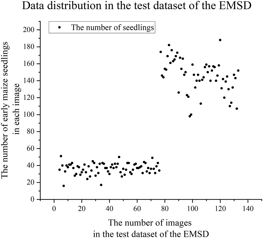 In the EMSD dataset, compared to the training dataset and validation dataset, the test dataset contains drone images taken at higher flight altitudes. Through the analysis of the test dataset (see Figure 3), we observed that the number of early maize seedlings in the images had two significant distribution characteristics: one type of images had less than 80 seedlings, while the other type had more than 80 seedlings. In order to more accurately evaluate the model’s early maize seedlings counting performance at different flight altitudes, we divide the test dataset into two subsets: Test Dataset A (images with 80 or less seedlings, total 2773 seedlings) and Test Dataset B (images with more than 80 seedlings, total 8315 seedlings).