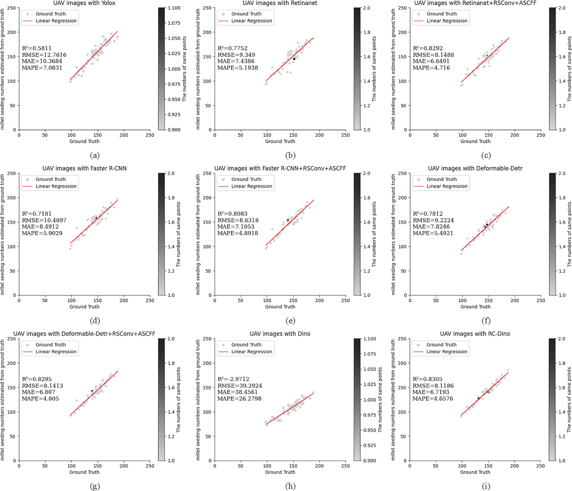 Figure 8. Count statistics for the baseline of the different models and their improved versions for the Test Dataset B: (A) UAV images with Yolox (R2=0.5811); (B) UAV images with Retinanet (R2=0.7752); (C) UAV images with Retinanet+RSConv+ASCFF (R2=0.8292); (D) UAV images with Faster R-CNN (R2=0.7181); (E) UAV images with Faster R-CNN+RSConv+ASCFF (R2=0.8083); (F) UAV images with Deformable-Detr (R2=0.7812); (G) UAV images with Deformable-Detr+RSConv+ASCFF (R2=0.8295); (H) UAV images with Dino (R2=-2.9712); and (I) UAV images with RC-Dino (R2=0.8305). Each subplot presents ground truth versus predicted counts with corresponding statistical metrics (R2, RMSE, MAE, and MAPE) for model evaluation on counting range 0-250.