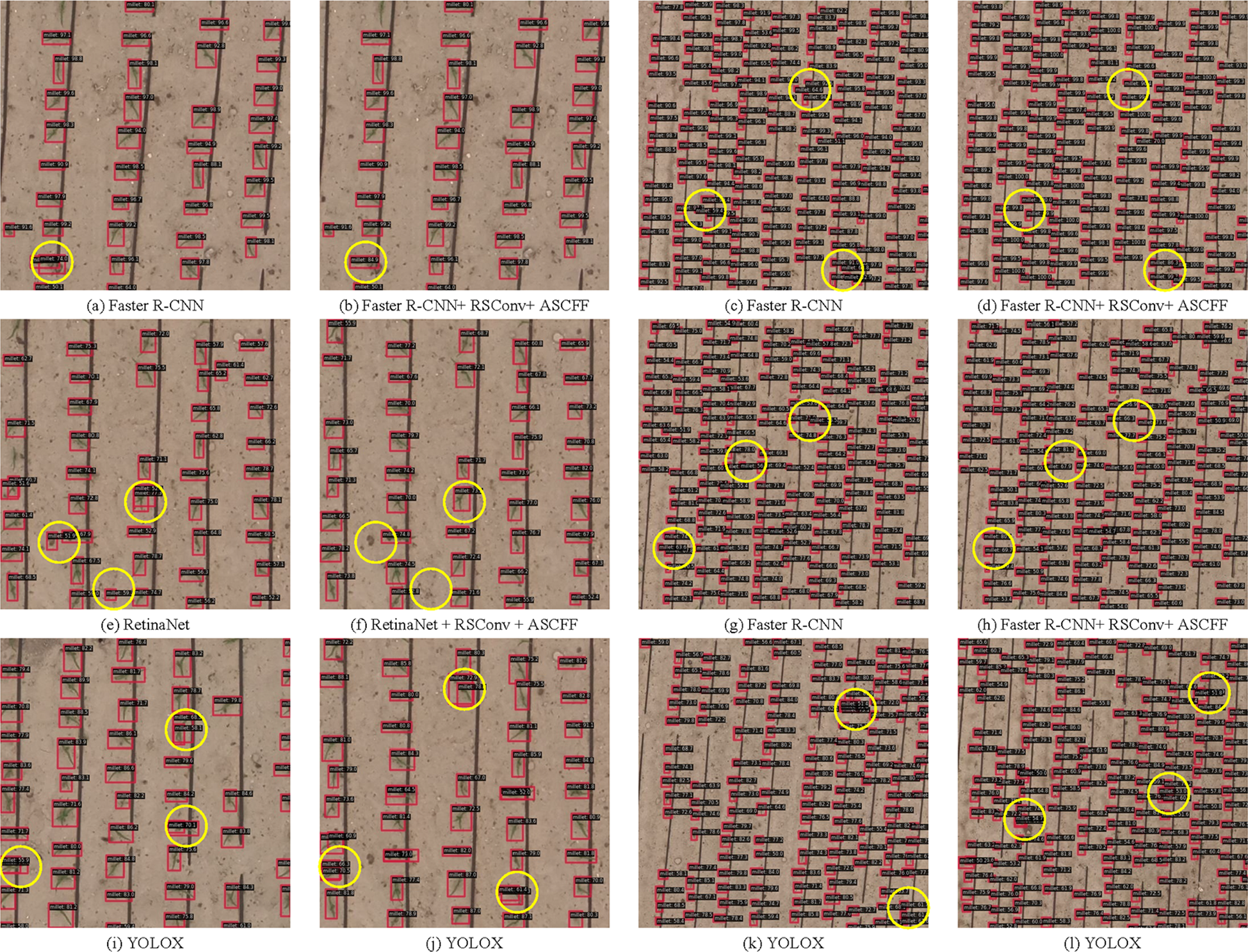 In light of the aforementioned experiments, it can be posited that the incorporation of RSCconv into the backbone facilitates the amplification, calibration, and optimization of early maize seedlings features within the feature maps. This results in an enhanced representation of small object features in the output of the backbone. Furthermore, the incorporation of ASCFF in the neck enables the adaptive spatial-channel fusion of multi-scale features. This fusion process enhances the representation of early maize seedlings features in deeper feature maps while preserving information in shallower feature maps. Consequently, the subsequent classification and localization detection heads exhibit higher precision in identifying and localizing small objects.