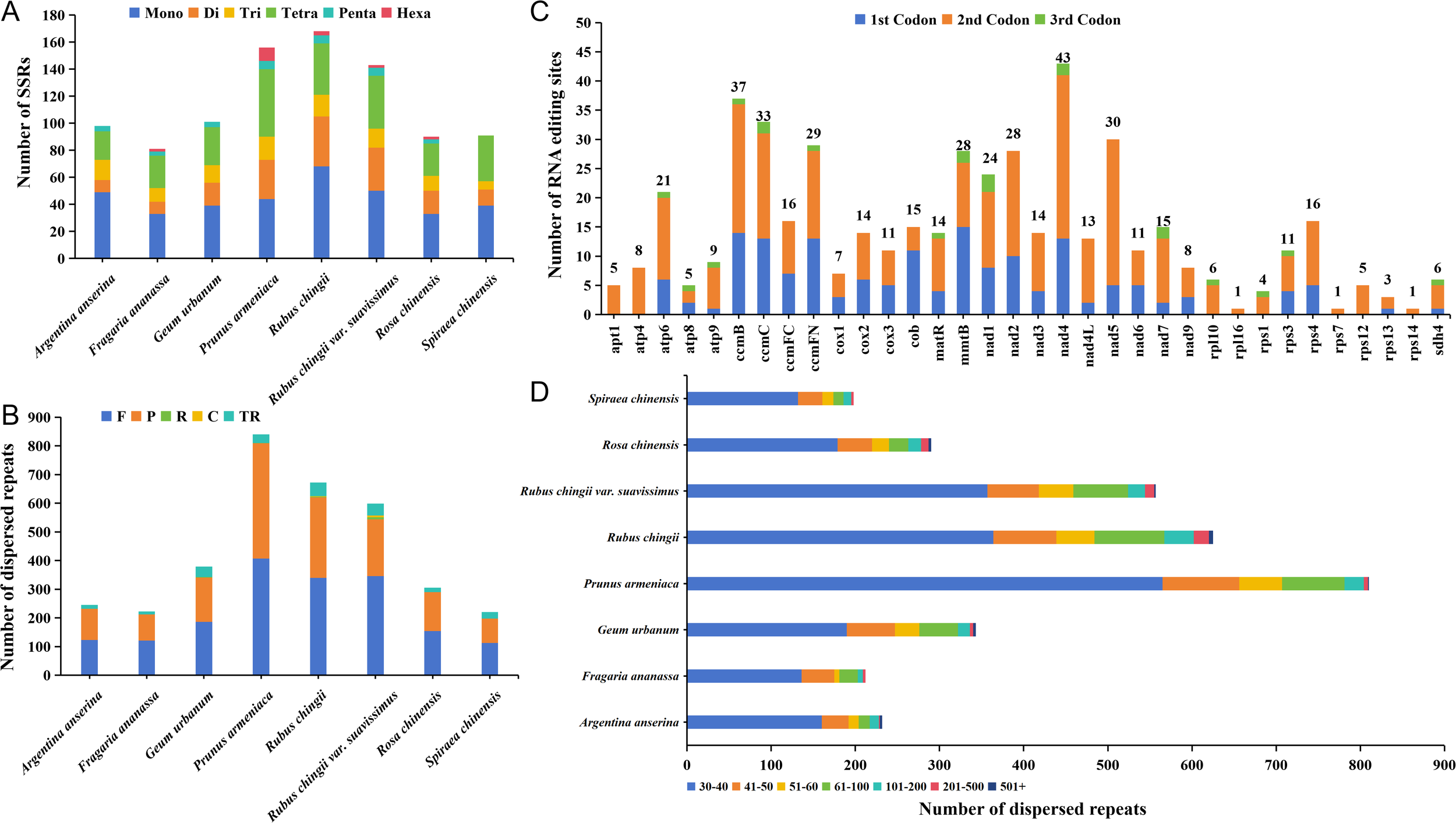 Figure 5. The different type sequence repeats analysis and RNA editing sites prediction. (A) Identification of SSR loci in eight Rosaceae mitogenomes. (B) Identification of dispersed sequence repeats from eight Rosaceae mitogenomes. (C) Prediction of RNA editing sites in the mitogenome of R. chingii var. suavissimus. (D) The length distribution of dispersed sequence repeats in eight Rosaceae mitogenomes. Mono, mononucleotide repeats; Di, dinucleotide repeats; Tri, trinucleotide repeats; Tetra, tetranucleotide repeats; Penta, pentanucleotide repeats; Hexa, hexanucleotide repeats; F, forward repeats; R, reverse repeats; P, palindromic repeats; C, complementary repeats; TR, tandem repeats.