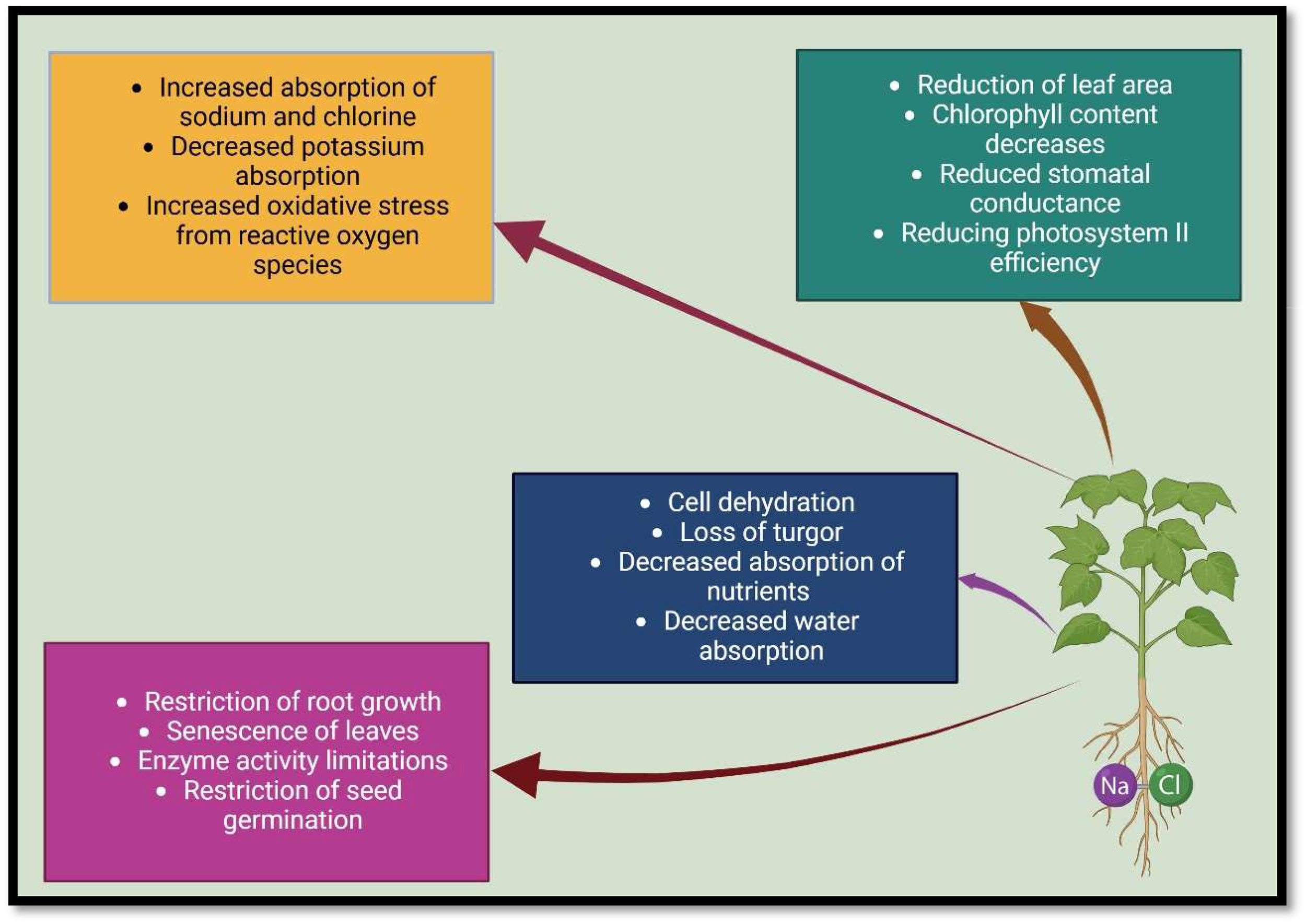 Salinity in soil can be caused by different kinds of salts, such as NaCl, Na2CO3, MgCl2, CaSO4, MgSO4, and Na2SO4, among which sodium chloride is most common in arid and semiarid soils (Flowers et al., 1977). Saline soils have an electrical conductivity (EC) of more than 4 decisiemens per meter (dS/m), and an osmotic pressure of -0.2 MPa, which is equal to about 40 mM NaCl (Santander et al., 2019). Due to salinity, the soil’s biological, chemical, and physical properties are destroyed, decreasing fertility and increases desertification (Diagne et al., 2020; Romero-Munar et al., 2019). A high salt concentration in soil solution reduces the osmotic potential of the soil and also suppresses the activities related to nutrients in plants, and leads to unfavourable Na+/Ca2+ and Na+/K+ ratios (Romero-Munar et al., 2019; Kumar and Verma, 2018) (Table 1).