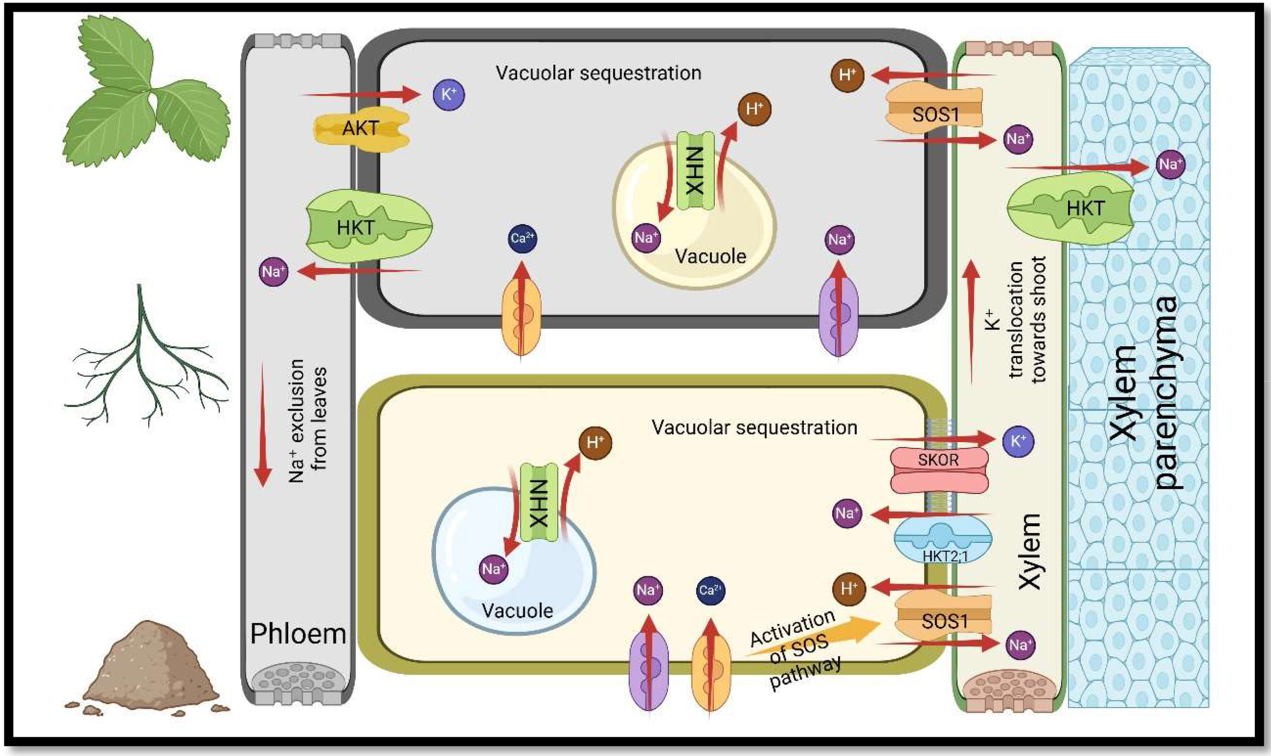 Osmotic regulation is another defense mechanism that helps plants control osmotic and ionic toxic impacts through the expression of genes involved in nutrient transport and partitioning, accumulation of solutes, and aquaporins (Li et al., 2020; Apse and Blumwald, 2007; Van Zelm et al., 2020). Salt Overly Sensitive 1 (SOS1) is a Na+/H+ antiporter in plasma membrane, which has an essential function in maintaining ions homeostasis and managing Na+ and K+ transport in plasma membrane and tonoplast (Li et al., 2020; Gao et al., 2020). The study conducted on Suaeda salsa showed that at 400mM NaCl concentration, Na+ was actively removed from the cytoplasm into the rhizosphere, while the expression of SOS1 was the highest in the roots (Gao et al., 2020). Furthermore, vacuolar Na+/H+ antiporters (NHXs) are responsible for the sequestration of Na+ into vacuoles, which is driven through the proton motive force generated by H+-PPase and H+-ATPase (VHA) (Diao et al., 2021; Gao et al., 2020). Moreover, The Stelar K+ outward rectifier channel (SKOR) is a K+ channel in plants that transports K+ from the roots to aerial parts (Li et al., 2023). SKOR identify as a transport protein with a role in loading K+ to the xylem, and if it was disrupted K+ content in shoots was significantly reduced, while K+ content in roots was not affected (Abbaspour et al., 2021; Sharma et al., 2013). Moreover, plasma membrane intrinsic proteins (PIPs), a plant’s aquaporin subfamily, was found to be the primary water absorption and transport channels in plant cells and can mediate the plant cell water loss under the stress of salt (Abbaspour et al., 2021).