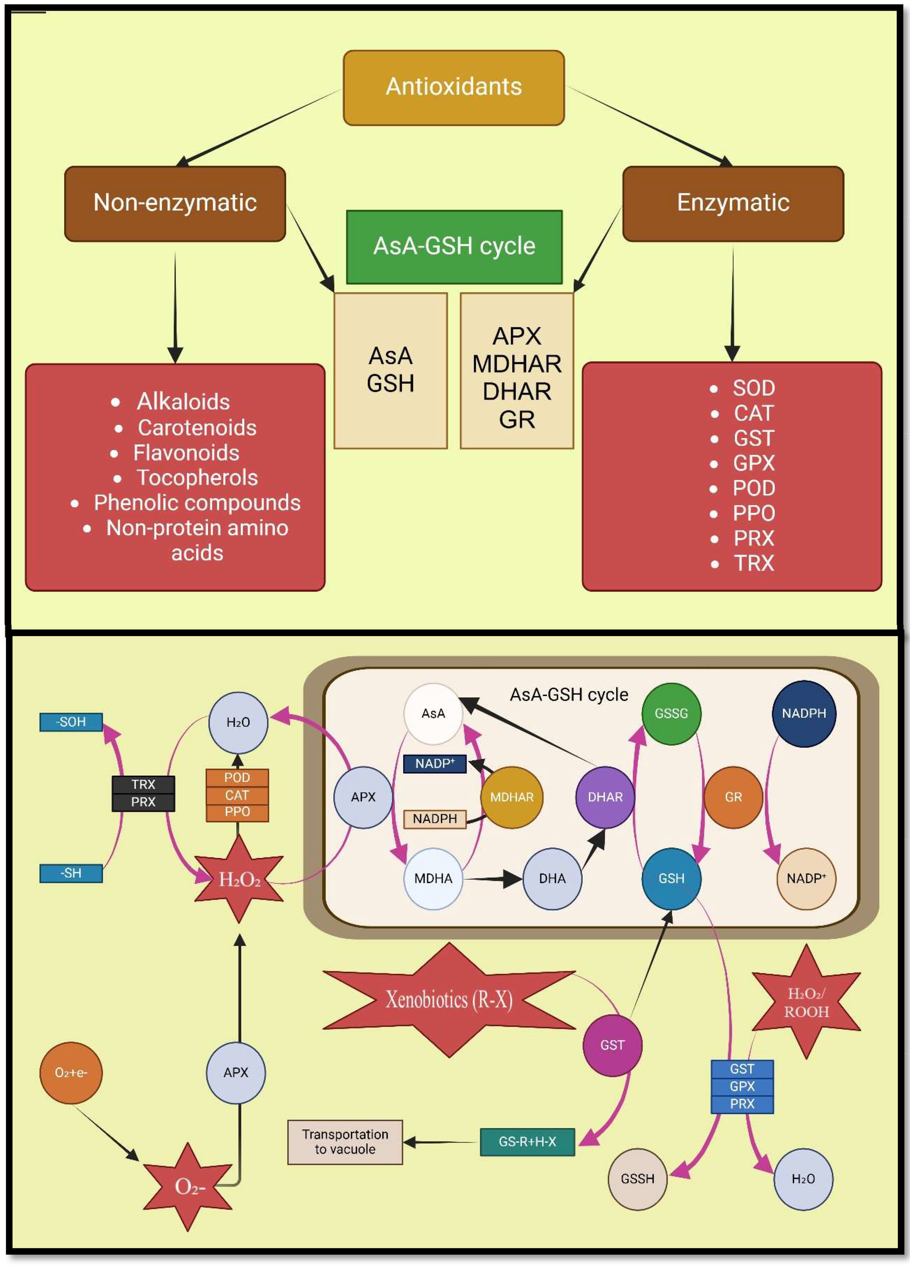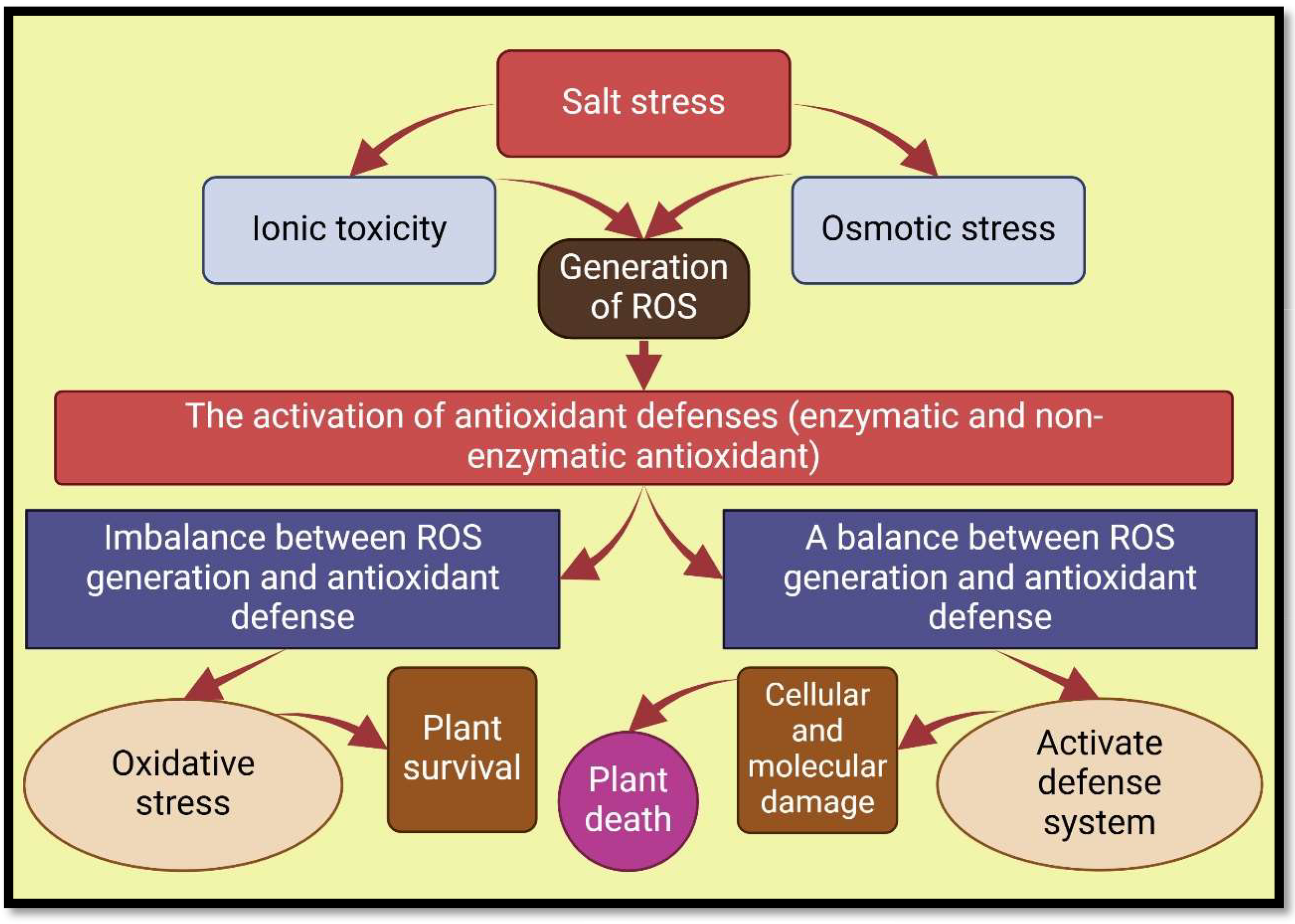 Increasing the production of ROS can be harmful to cells, but they also regulate numerous fundamental plant processes, including salt stress response (Chen et al., 2020). Nevertheless, plants have evolved detoxification mechanisms to combat oxidative damage, including the induction of secondary metabolite production and a wide range of enzymatic and non-enzymatic antioxidants (Behdad et al., 2020; Toscano et al., 2019; Sharma et al., 2012). The antioxidant enzymes that reduce salinity-induced ROS include catalase (CAT), peroxidase (POD), superoxide dismutase (SOD), ascorbate peroxidase (APX), glutathione reductase (GR), and polyphenol oxidases (PPO) (Janah et al., 2021a; Waszczak et al., 2018; Apel and Hirt, 2004). In contrast, non-enzymatic antioxidants that destroy ROS include glutathione (GSH), ascorbic acid (AsA), carotenoids, flavonoids, and α-tocopherol (Foyer and Noctor, 2011; Chaparzadeh et al., 2004).