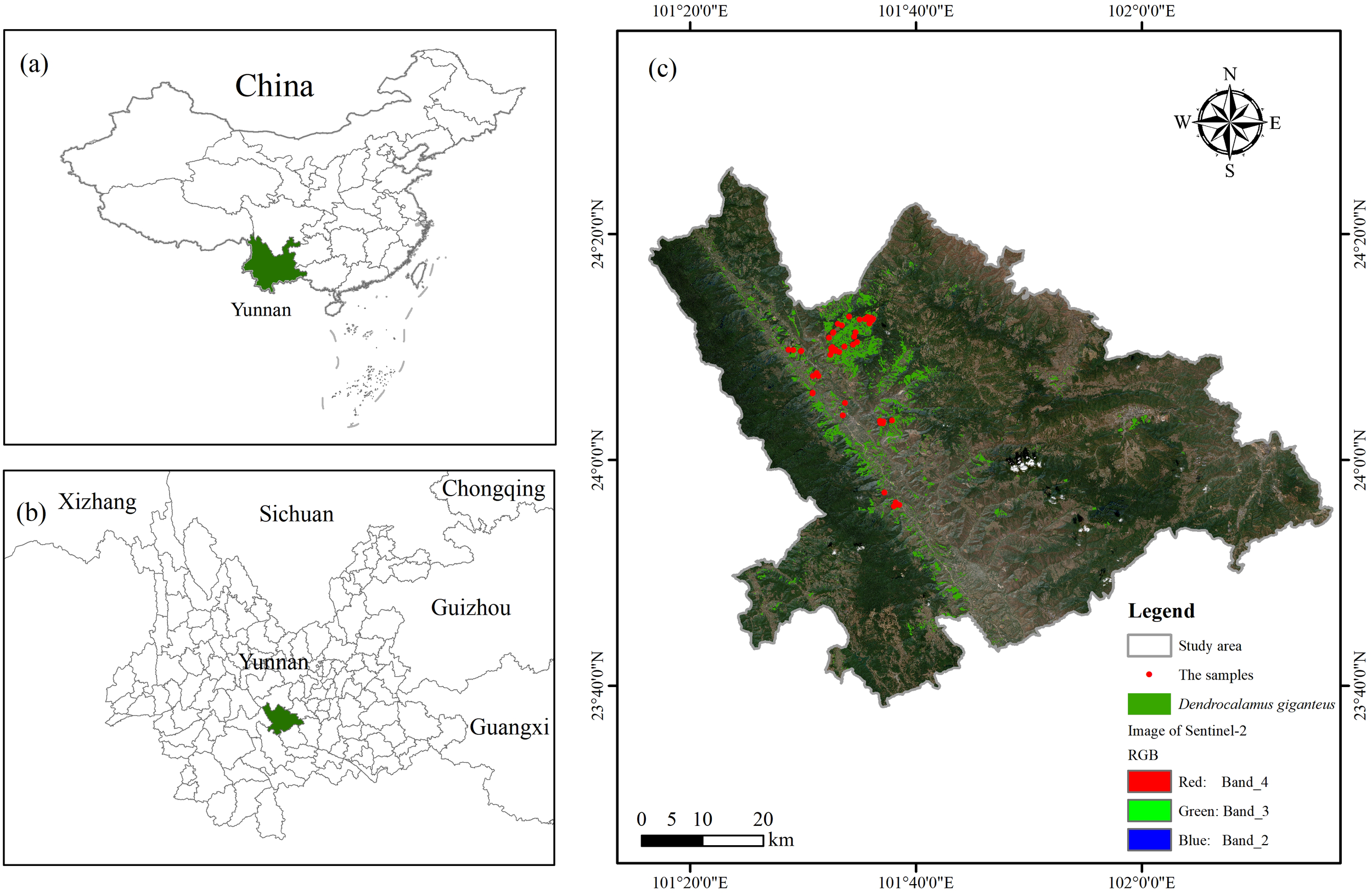 This study involved the establishment of 51 circular plots, each measuring 8.5 m in radius, situated in Xinping County, within Yuxi City, Yunnan Province. This data was collected on January 8, 2024, and Figure 1 depicts the arrangement of the sample plots. In the process of sample plot design, firstly, based on the findings from the Yunnan Province Forest Resources Planning and Design Survey, and using the Thousand Search Moment SR3 (Pro version) differential localizer (SR3, Pro version, Qianxun SI, Chengdu, Sichuan, China, https://www.qxwz.com/) in the fixed solution state of the center coordinates of the sample circle, to ensure the accuracy of the coordinates of the sample plots. In the process of data acquisition, the hemisphere photography method is adopted (Zeng et al., 2015), that is, 9 shooting points are evenly selected in the sample circle to ensure that each shooting point can cover the distribution area of the bamboo canopy, and then the fisheye lens is used to accurately shoot each point to ensure that each sample point can capture 9 fisheye photos. To guarantee accurate measurement results, it is essential that the sample site maintains suitable lighting conditions, and direct sunlight should be avoided when shooting, so as not to accurately reflect the real situation of the sample. In the process of pre-processing the fisheye photos of 51 sample plots conforming to the standard, all images were initially converted to JPG format. Subsequently, their aspect ratios were adjusted to a consistent size of 3000×4000 pixels. The images were subsequently processed using CANEYE (CANEYE, version 6.495, INRA, Paris, France, https://www6.paca.inrae.fr/can-eye/), a hemispherical image analysis software developed in MATLAB (MATLAB, version R2018a, MathWorks, Natick, MA, USA, https://www.mathworks.com/), with appropriate parameters configured. In the CANEYE software, first input the image resolution of 3000×4000, select “Create” in the “Optical Center and Projection Function”, set the “Line” value to 1228, the “Column” value to 1840, and the “P1” value to 0.0305472, observe the “Distance to the optical center (pixels)”, where Zenith (°) = P1.D (pix), then set the “COI (°)” value to 45, and in the “Fapar Computation” box, enter the values of “Day of Year” and “Latitude (%)” according to the photo acquisition time and location information at the time of acquisition, so as to perform calculation analysis. After analysis, LAI values for Dendrocalamus giganteus were extracted from 51 sample plots.