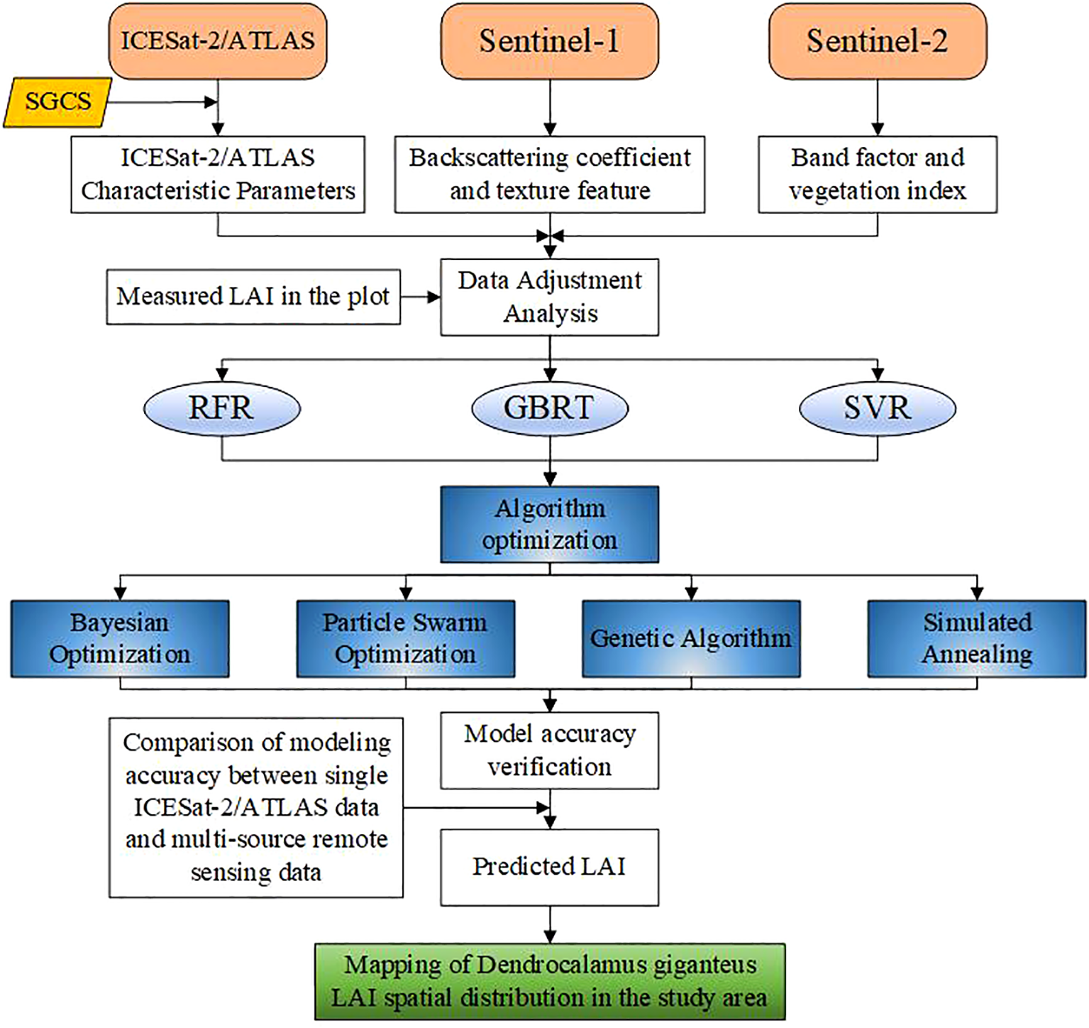 In this research, the SGCS method based on the simple Kriging method was first used to interpolate ICESat-2/ATLAS light spots to obtain planar grid information, and then the ICESat-2/ATLAS variables were coordinated with Sentinel-1/-2 variables. The relationship between variables and measured LAI was assessed using the Pearson correlation coefficient. RFR, GBRT, and SVR were respectively used to construct LAI estimation models. Then, BO, PSO, GA, and SA were used to optimize the RFR, GBRT, and SVR models respectively. Then, the estimation model of LAI was constructed using BO-RFR, BO-GBRT, BO-SVR, PSO-RFR, PSO-GBRT, PSO-SVR, GA-RFR, GA-GBRT, GA-SVR, SA-RFR, SA-GBRT and SA-SVR methods. A spatial distribution map of LAI was generated using the optimal model. Figure 2 illustrates the technical approach employed in this research.