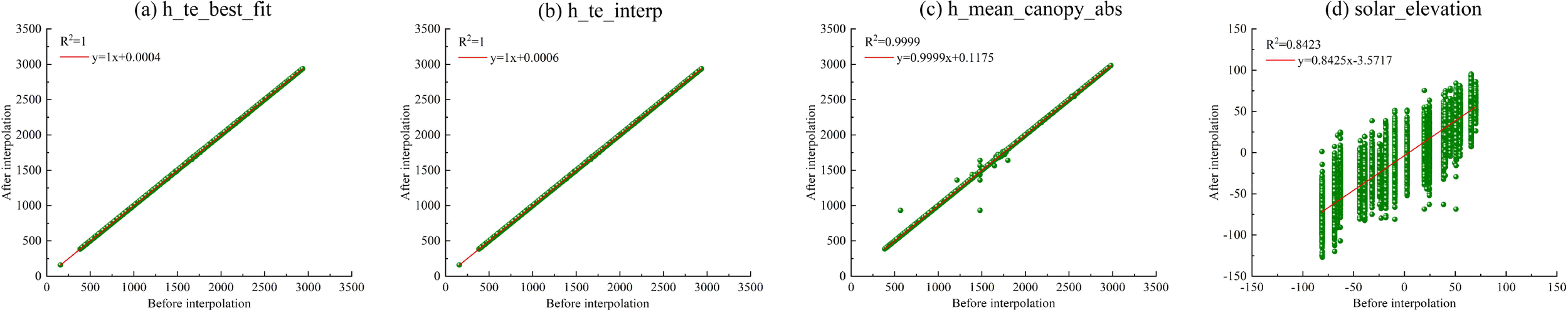 To effectively differentiate between ground photons and canopy top photons in the de-noised signal, this study utilizes an enhanced version of the progressive TIN densification filter (PTD) technique for classification purposes (Nie et al., 2017). The recognition accuracy of ground photons by this method is higher in areas with large altitude differences and complex terrain. The algorithm mainly includes four parameters (Nie et al., 2018; Zhu et al., 2018, Zhu et al., 2020a): The predefined window size is set at 200 m. Di represents the distance between unclassified photons and the two closest seed ground photons. At refers to the angle created by the line connecting the unclassified photons to their associated seed ground photons and the line extending to the ground surface. Furthermore, Ds denotes the vertical distance from the unclassified photons to the ground surface (Xi et al., 2023). To begin, choose the photon exhibiting the lowest elevation from each window to function as the initial seed ground photon. Subsequently, connect these seed photons to form the initial segment line, categorizing the remaining photons as unclassified. Once the distance Di for each unclassified photon is calculated, if the maximum Di exceeds the established threshold, photons with elevations below this maximum are extracted from the unclassified set as ground photons, ensuring that no canopy photons are included. To identify the optimal ground segment line, an interval of 10 is established, testing values ranging from 10 to 50 with a threshold of 20. This process involves multiple self-iterations until no new seed ground photons are generated. After the initial section line is generated, the improved section line is generated by the Douglas-Peucker algorithm. A cubic spline interpolation method is employed to fit the ground photons and create a model of the ground surface, enabling the extraction of the final ground photon data. Photons are identified as ground photons only when Ds is below 1 m; the remaining photons are classified as vegetation photons (Zhang et al., 2021).