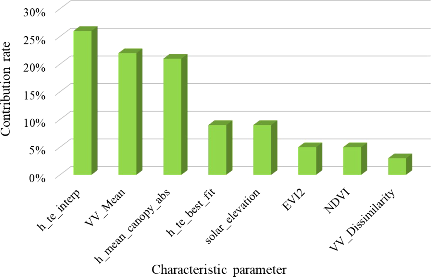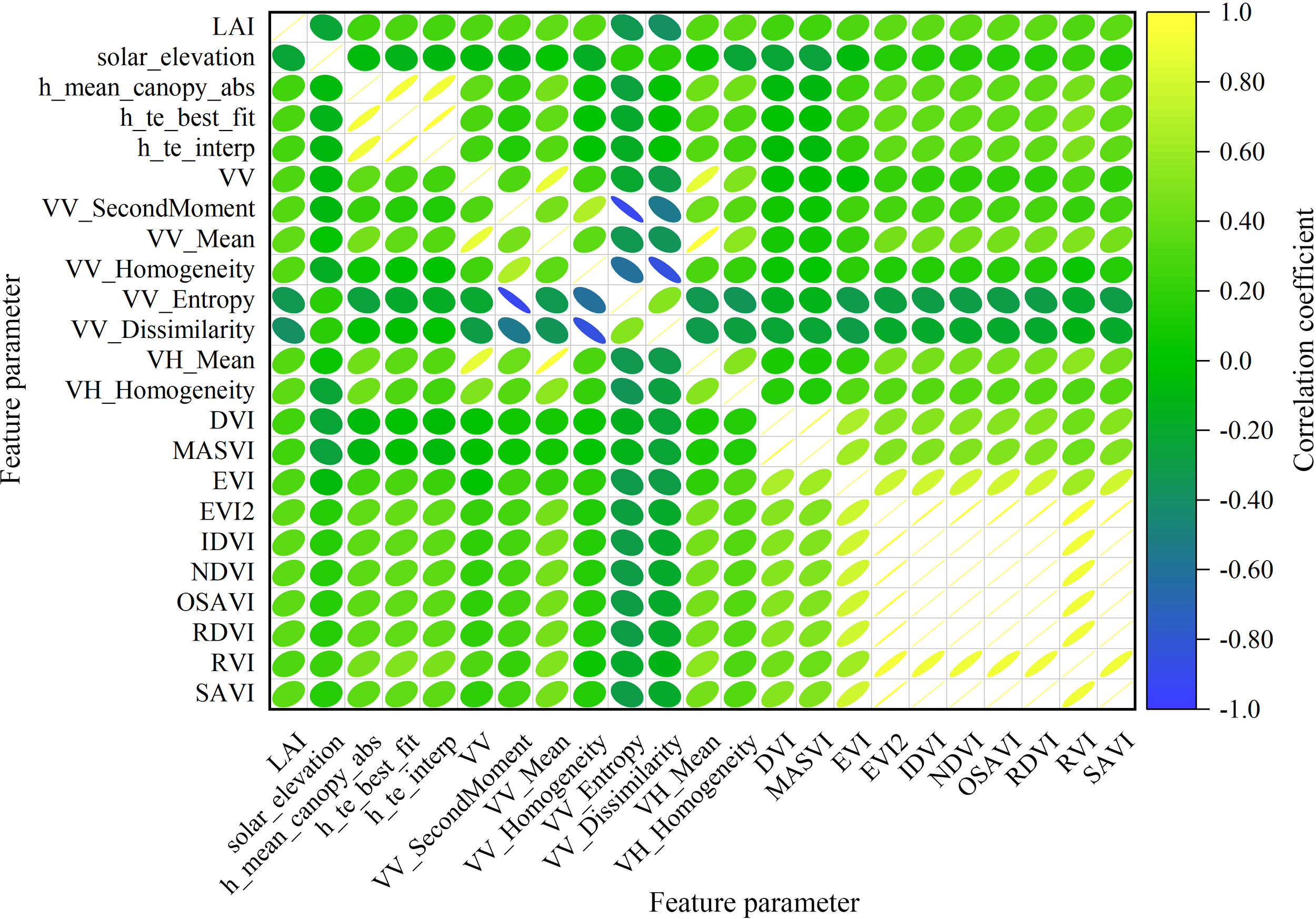 This study effectively employed Sentinel-1 imagery to extract backscatter coefficients and texture features. The extracted backscatter coefficients comprise VV (co-polarized) and VH (cross-polarized). The texture features extracted from VV and VH include: Mean, offering an average measure; Variance, signifying the spread of values; Homogeneity, reflecting uniformity; Contrast, highlighting differences between light and dark areas; Dissimilarity, indicating the degree of dissimilarity between pixels; Entropy, measuring randomness or disorder; Second Moment, related to smoothness or roughness; and Correlation, denoting the relationship between neighboring pixels. The calculation formulas for these texture features are clearly presented in Table 3.