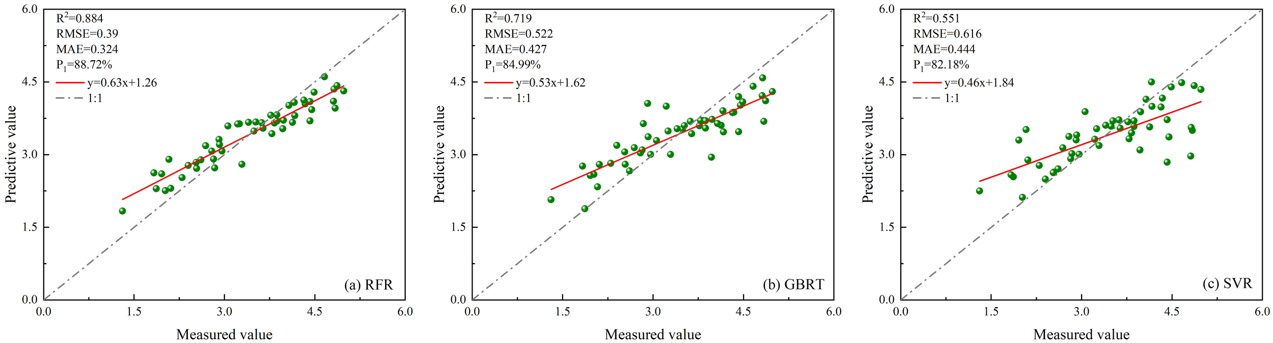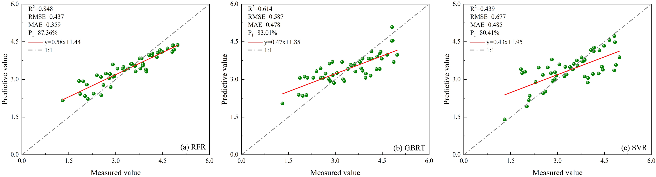 In this research, we apply the leave-one-out cross-validation technique to assess the model’s predictive capacity and the precision of its LAI estimations from remote sensing. This approach involves sequentially removing a single data point from the dataset, training the model on the remaining data, and testing it on the omitted point. Repeating this procedure for all data points enables a comprehensive evaluation of the model’s generalization performance and enhances the accuracy of LAI estimation derived from remote sensing (Fushiki, 2011). The evaluation metrics used to assess model performance include the coefficient of determination (R2), root mean square error (RMSE), mean absolute error (MAE), and overall estimation accuracy (P1). The corresponding formula for the calculation is as follows: